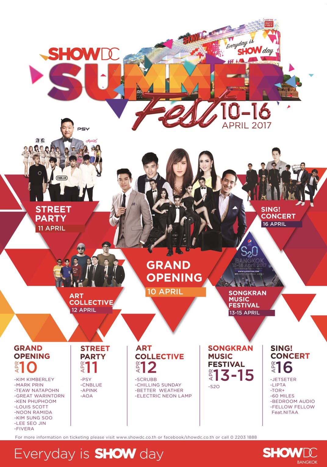 โชว์ ดีซี ศูนย์การค้าและเอ็นเตอร์เทนเมนต์สุดหรูครบวงจรแห่งแรกของไทย บนถนนพระราม 9 ขอเชิญทุกท่านร่วมสัมผัสความเป็น International Entertainment Destination ที่ดีที่สุดแห่งภูมิภาคเอเชียตะวันออกเฉียงใต้ กับงานเฉลิมฉลองการเปิดตัวศูนย์การค้าโชว์ ดีซี ที่จัดขึ้นอย่างยิ่งใหญ่ตลอดทั้งสัปดาห์ ภายใต้ชื่องาน SHOW DC GRAND OPENING SUMMER FEST 2017 : Everyday is SHOW day พบปรากฏการณ์ความบันเทิงสุดมันส์จากศิลปินเกาหลีสุดฮอตที่บินลัดฟ้ามาร่วมงานนำทีมโดย “PSY” (ไซ) เจ้าพ่อเพลงฮิต “กังนัมสไตล์” ที่โด่งดังไปทั่วโลก ร่วมด้วย CNBLUE / APINK / AOA และดารา-ศิลปิน แถวหน้าของเมืองไทยอย่าง คิม คิมเบอร์ลี่ / หมาก ปริ ฯลฯ ระหว่างวันที่ 10-16 เมษายน