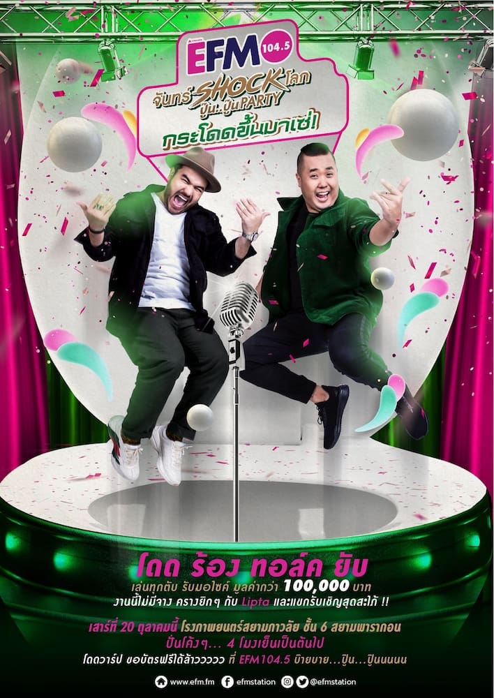 ถึงเวลากลับมาเรียกเสียงฮากันอีกครั้งของสองดีเจคู่หู ดีเจ.โอ๊ต ปราโมทย์ ปาทาน และ ดีเจ.อาร์ต มารุต ชื่นชมบูรณ์ จากรายการ จันทร์ Shock โลก ปู๊น…ปู๊น ทางคลื่นอีเอฟเอ็ม 104.5 เพลงเพราะ อารมณ์ดี ที่จะชวนคุณไป โดด ร้อง ทอล์ค ยับ กันในงาน “อีเอฟเอ็ม จันทร์ Shock โลก ปู๊น..ปู๊น Party กระโดดขึ้นมาเซ่!” เล่นทุกตับ ลุ้นรับรางวัลใหญ่ มอเตอร์ไซค์มูลค่ากว่า 100,000 บาท พร้อมของรางวัลสุดช็อกอีกเพียบ งานนี้ไม่มีจาง ครางยิกๆ ไปกับ ลิปตา และแขกรับเชิญสุดเซอร์ไพร้ส์ ในวันเสาร์ที่ 20 ตุลาคมนี้ ที่โรงภาพยนตร์สยามภาวลัย ชั้น 6 สยามพารากอน ตั้งแต่เวลา 16.00 น. เป็นต้นไป ติดตามรับบัตรฟรี! และดูรายละเอียดเพิ่มเติมได้ที่ อีเอฟเอ็ม 104.5 หรือคลิ๊กที่ www.efm.fm แล้วเจอกัน ปู๊น ปู๊น!!