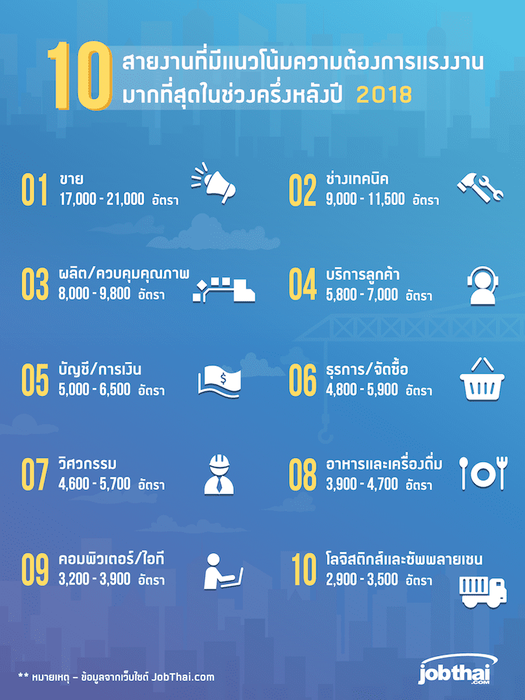 จ๊อบไทยดอทคอม (JobThai.com) เว็บไซต์หางาน สมัครงาน อันดับ 1 ของประเทศไทย คาดการณ์ภาพรวมสถานการณ์แรงงานในช่วงครึ่งปีหลังของปี 2561 จากการวิเคราะห์ฐานข้อมูลของเว็บไซต์ตั้งแต่ปี 2016 จนถึงปัจจุบัน พบ 10 สายงานที่คาดว่าต้องการแรงงานมากที่สุด ได้แก่ 1) ขาย จำนวน 17,000 – 21,000 อัตรา ตามมาด้วย 2) ช่างเทคนิค จำนวน 9,000 – 11,500 อัตรา 3) ผลิต/ควบคุมคุณภาพ จำนวน 8,000 – 9,800 อัตรา 4) บริการลูกค้า จำนวน 5,800 – 7,000 อัตรา 5) บัญชี/การเงิน จำนวน 5,000 – 6,500 อัตรา 6) ธุรการ/จัดซื้อ จำนวน 4,800 – 5,900 อัตรา 7) วิศวกรรม จำนวน 4,600 – 5,700 อัตรา 8) อาหารและเครื่องดื่ม จำนวน 3,900 – 4,700 อัตรา 9) คอมพิวเตอร์/ไอที จำนวน 3,200 – 3,900 อัตรา และ 10) โลจิสติกส์และซัพพลายเชน จำนวน 2,900 – 3,500 อัตรา ตามลำดับ ซึ่งสอดคล้องกับผลสำรวจของสำนักงานสถิติแห่งชาติ ประจำเดือนเมษายน 2561 ที่พบว่าความต้องการแรงงานของภาคการผลิต ภาคขนส่ง ตลอดจนภาคการบริการมีจำนวนเพิ่มขึ้นอย่างต่อเนื่อง