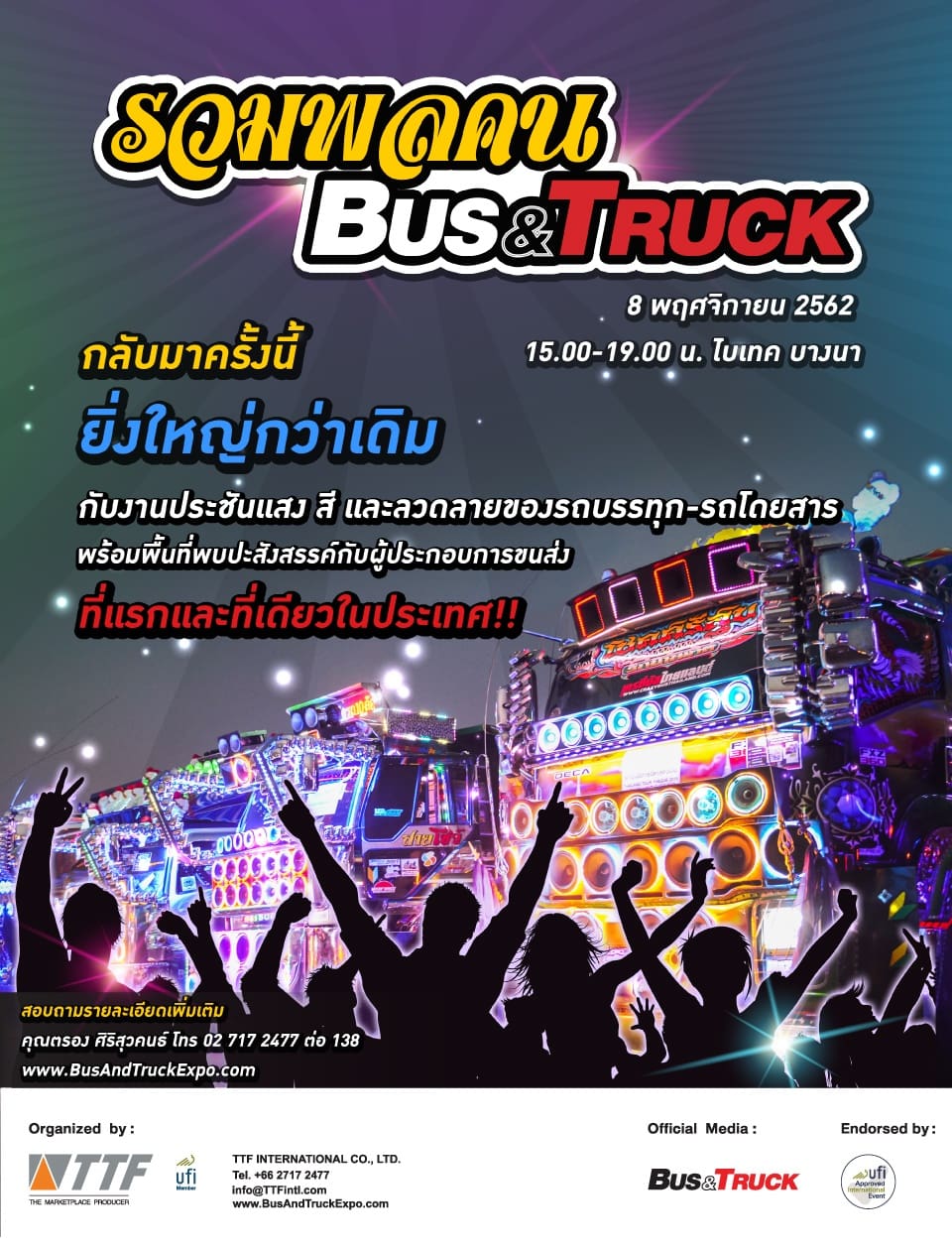 บริษัท ทีทีเอฟ อินเตอร์เนชั่นแนล จำกัด นำโดย คุณชาตรี มรรคา กรรมการผู้จัดการ ประกาศความพร้อมจัดงาน BUS & TRUCK ’19 งานแสดงรถเพื่อการพาณิชย์และกิจการพิเศษครั้งที่ 16 บนพื้นที่กว่า 7,500 ตารางเมตร ระหว่างวันที่ 7-9 พฤศจิกายน 2562 ณ ศูนย์นิทรรศการและการประชุมไบเทค กรุงเทพฯ โดยปีนี้ได้รับการตอบรับเป็นอย่างดีจากค่ายผู้ผลิตและจำหน่ายรถเพื่อการพาณิชย์ชั้นนำ อาทิ HINO, HYUNDAI, SAKUN C และตัวแทนจำหน่ายอุปกรณ์ เครื่องมือ อะไหล่ สำหรับยานยนต์จากบริษัทชั้นนำมากมาย นอกจากนี้ งาน BUS & TRUCK ในปีนี้ยังได้รับการสนับสนุนจากหน่วยงานภาครัฐและสมาคมอีกมากมาย รวมกว่า 26 หน่วยงาน ที่จะมาร่วมขับเคลื่อนอุตสาหกรรมขนส่งในยุคดิจิทัล อาทิ กระทรวงคมนาคม กรมการขนส่งทางบก สมาคมขนส่งทางบกแห่งประเทศไทย สมาคมขนส่งสินค้าและโลจิสติกส์ไทย สมาคมผู้ประกอบการชิ้นส่วนยานยนต์และอะไหล่ทดแทนไทย สมาคมผู้ค้าอะไหล่วรจักร เป็นต้น