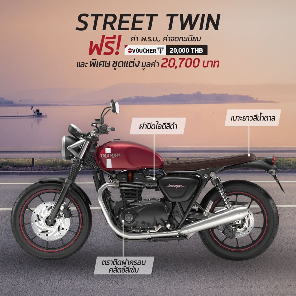 เริ่มที่ไลน์คลาสสิก “สตรีท ทวิน” รับข้อเสนอสุดพิเศษ Gift Voucher มูลค่า 20,000 บาท พร้อมอุปกรณ์เสริมมูลค่ารวม 20,700 บาท “สตรีทสแครมเบลอร์” รับ Gift Voucher มูลค่า 20,000 บาท และอุปกรณ์เสริมมูลค่ารวม 23,290 บาท “บอนเนวิลล์ ที100” และ “บอนเนวิลล์ ที100 แบล็ค” รับ Gift Voucher มูลค่า10,000 บาท
