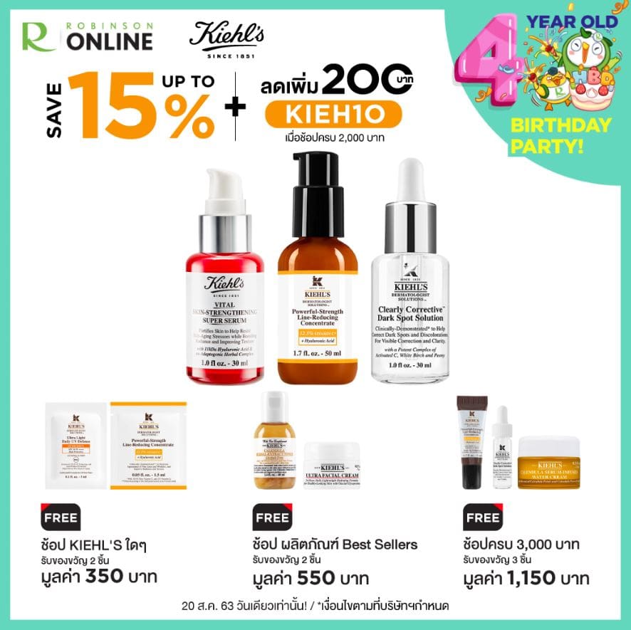 พิเศษเฉพาะวันที่ 20 สิงหาคม 2563 สำหรับแฟนพันธุ์แท้ ผลิตภัณฑ์ Kiehl’s ลดสูงสุด 15% และลดเพิ่มอีก 200 บาท เพียงกรอกโค้ด KIEH10 เมื่อช้อปครบ 2,000 บาท (หลังจากหักส่วนลดแล้ว) นอกจากนี้เมื่อสั่งซื้อผลิตภัณฑ์ ยังได้รับของขวัญพิเศษ อาทิ