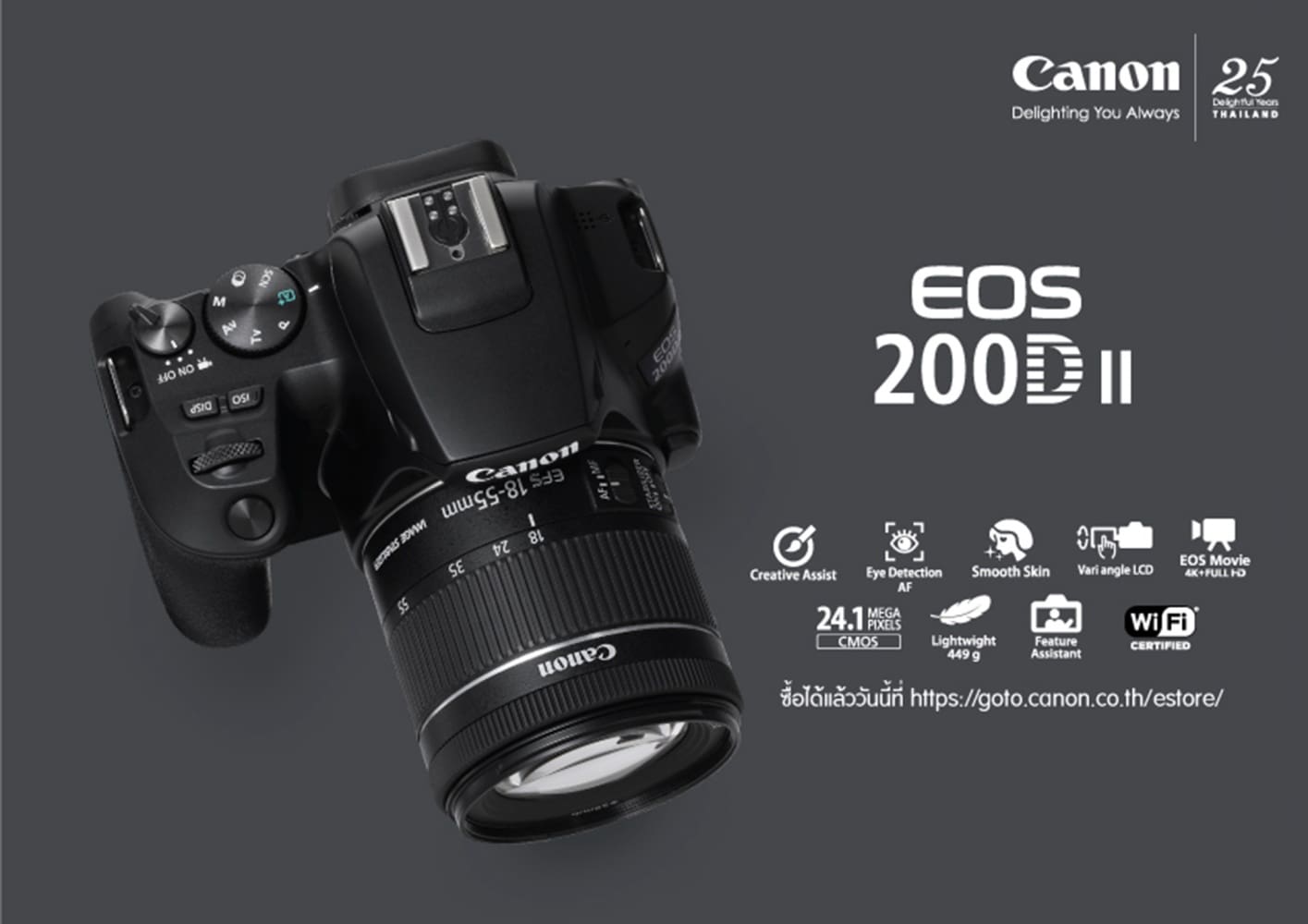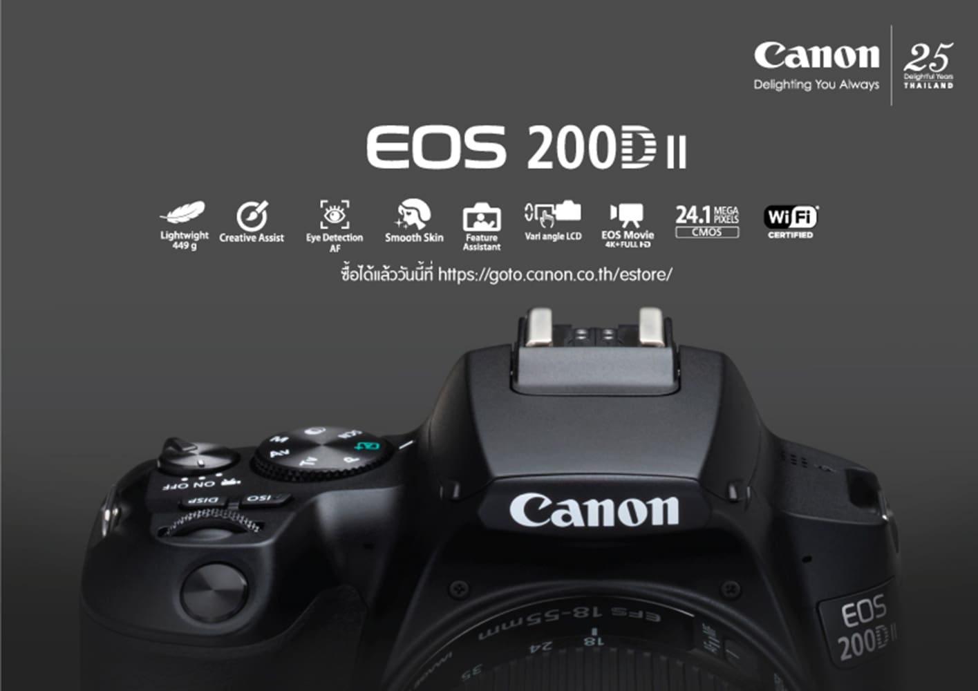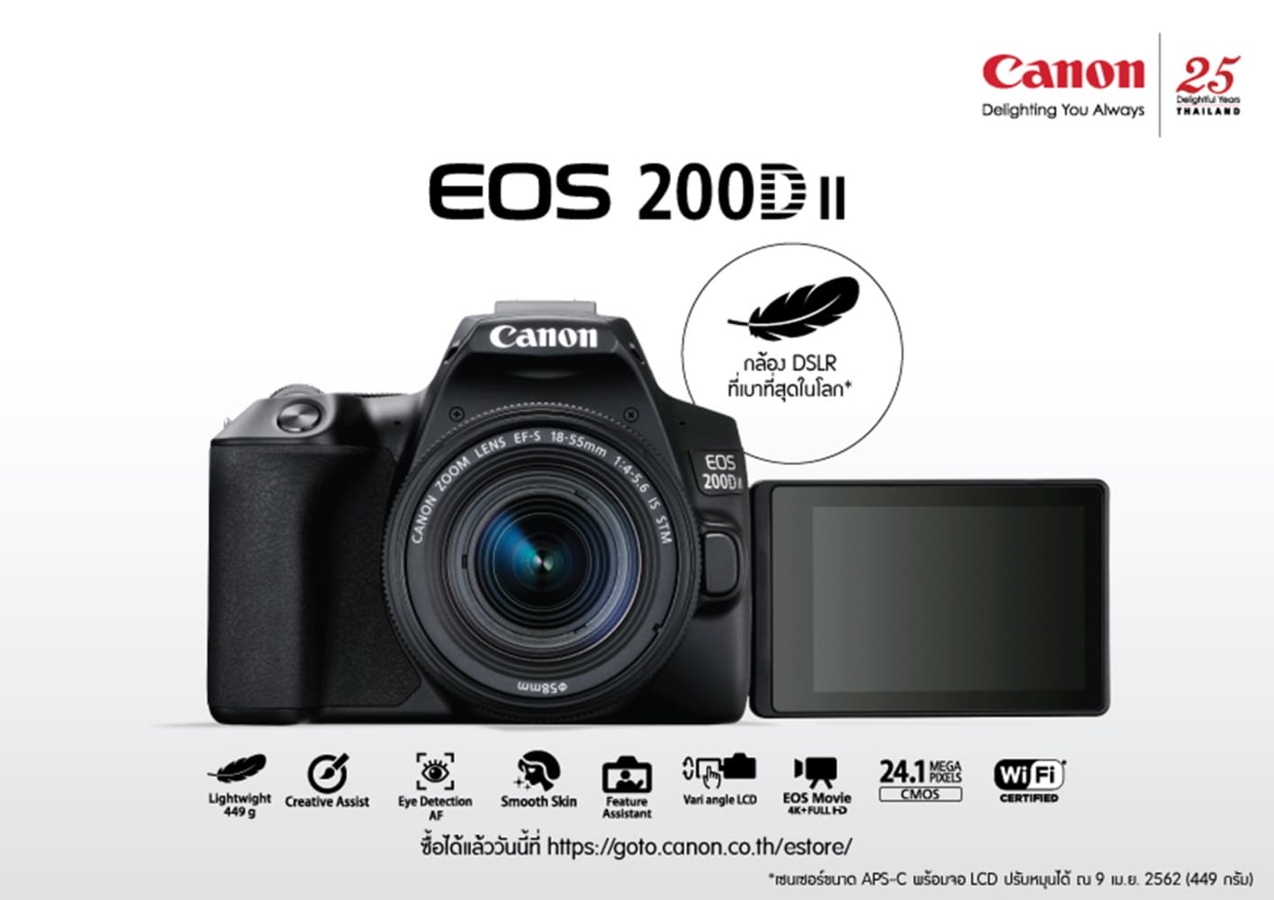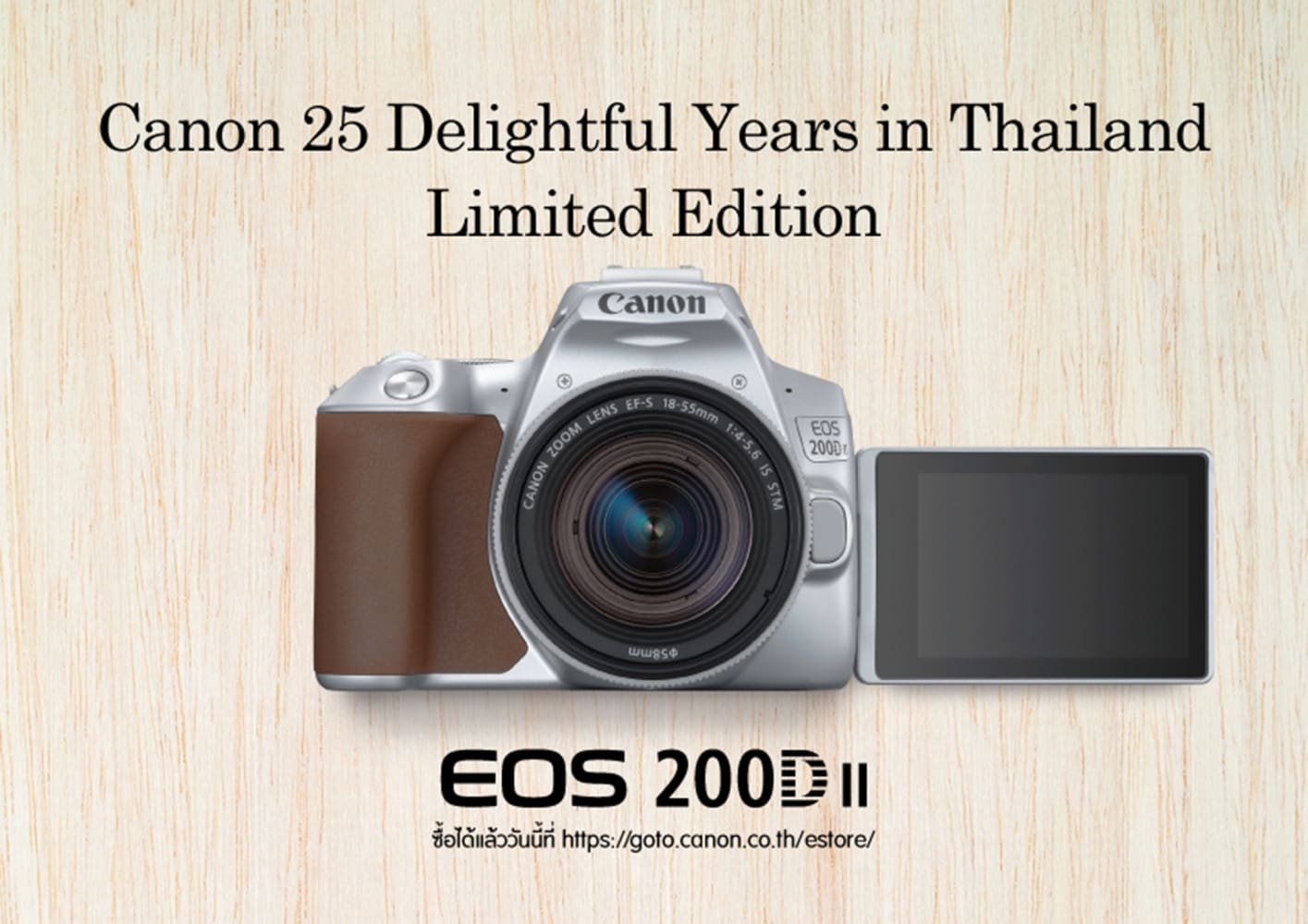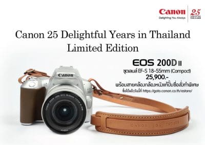 EOS 200D II ราคาเริ่มต้นเพียง 23,900 บาท พร้อมวางจำหน่ายที่แรกที่ Canon E-Store: https://goto.canon.co.th/estore/ ตั้งแต่วันที่ 10 พฤษภาคม 2562 เป็นต้นไป พร้อมโปรโมชันสุดพิเศษ ผ่อน 0% นาน 10 เดือน และเนื่องในโอกาสแคนนอนครบรอบ 25 ปี จึงมีกล้องสีพิเศษ (สีเงิน) จำหน่ายในจำนวนจำกัดเพียง 25 ตัว พร้อมสายคล้องกล้องหนังแท้ที่สามารถสลักชื่อบนสายได้ หากมีข้อสงสัยสามารถสอบถามข้อมูลเพิ่มเติมได้ที่ 0-2344-9988 เว็บไซต์ www.cannon.co.th หรือ facebook.com/canon.thailand