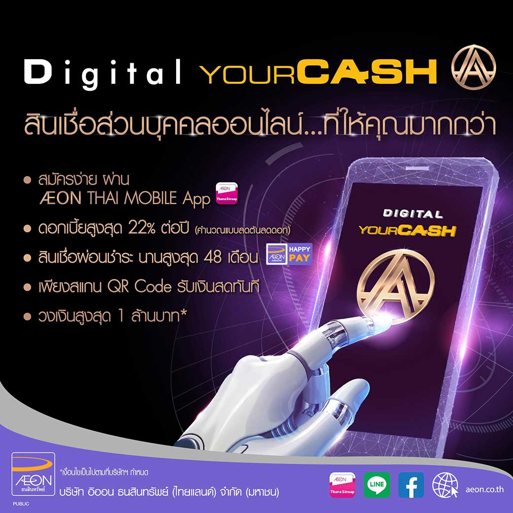 “ดิจิตอล ยัวร์แคช-เอ” อีกหนึ่งผู้ช่วยทางการเงินจากอิออน ที่ช่วยให้การบริหารการเงินมีความยืดหยุ่น และมีประสิทธิภาพมากยิ่งขึ้น สมัครง่ายทุกช่องทาง ทั้ง www.aeon.co.th AEON THAI MOBILE App สาขาอิออนทั่วประเทศ เมื่อได้รับอนุมัติ ลูกค้าเพียงยืนยันตัวตนที่สาขาอิออนและเปิดใช้งานผ่านแอป AEON THAI MOBILE ก็ใช้บริการได้ทันที