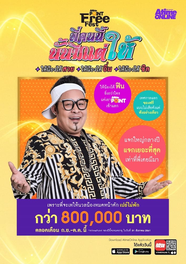 นาทีนี้จะมีใครให้หนูได้เท่าป๋า… AtimeOnline แจกหนักจัดใหญ่เทให้หมดหน้าตัก เปย์ไม่พักกว่า 8 แสนบาท! กับกิจกรรม AtimePoint Free Fest พี่คนนี้นั้นมีแต่ให้ (เอไทม์พ้อยท์ ฟรี เฟส พี่คนนี้นั้นมีแต่ให้)” เอาใจน้องคนฟังทั้งหลายให้น้องได้สวย ให้น้องได้อิ่ม ให้น้องได้ชิล กับเทศกาลแจกของฟรีเยอะที่สุดเท่าที่เคยมีมา เพียงนำ AtimePoint มาแลกให้กระหน่ำ กับของรางวัลหลากหลายที่ขนมาให้เลือก สวยกับเครื่องสำอางค์แบรนด์ดัง , Voucher เสริมความงาม, นวด&สปา อิ่มกับอาหารรสเลิศระดับโรงแรมหรูริมแม่น้ำเจ้าพระยา ไปจนถึงจัดหนักกับบุฟเฟ่ต์ชาบูจนตัวแตก แล้วชิลกันต่อกับแพ็คเกจที่พักและกิจกรรมที่ใช่ในสไตล์คุณ บอกเลยว่าความพิเศษนี้สำหรับสาวก AtimeOnline เท่านั้น! ใครยังไม่มีแอพพลิเคชั่น AtimeOnline รีบโหลด รีบเปิดฟัง แล้วรีบเข้ามาแลกของฟรีได้ตลอดเดือนกันยายน – ตุลาคมนี้ ติดตามรายละเอียดเพิ่มเติมได้ทาง Facebook : AtimeOnline และ http://atimeonline.com … รีบเถอะจ้ะ ของรางวัลเป็นพรวนรออยู่