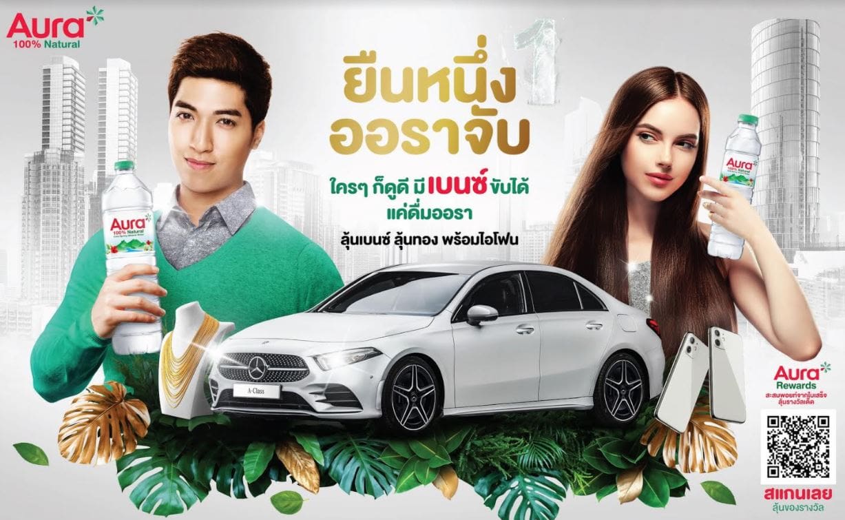 ครั้งแรกจาก น้ำแร่ออรา น้ำแร่ธรรมชาติจากแหล่งน้ำพุเย็น บนเทือกเขาสูง 2,700 ฟุต จัดหนัก แจกจริง รวมมูลค่าเกือบ 4 ล้านบาท ภายใต้แคมเปญ ออรา รีวอร์ด (AURA Rewards) ยืนหนึ่ง ออราจับ ลุ้นรางวัลรถยนต์ Mercedes Benz A200 AMG Dynamic มูลค่า 2.49 ล้านบาท ประกอบนอกทั้งคัน (ประเทศ เพียง 200 คันเท่านั้น) พร้อมรางวัลอื่น ๆ อีกมากมาย อาทิ iPhone 11 สร้อยคอทองคำ บัตรที่พักโรงแรม วีรันดา น้ำแร่ออรา และ น้ำผลไม้ทิปโก้ 100%