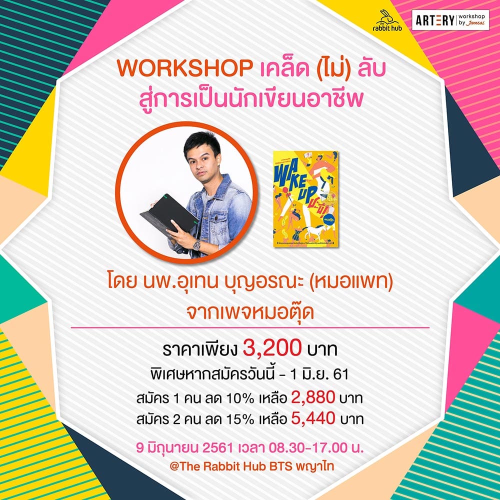 อาเทอรี่ เวิร์คชอป บาย แจ่มใส (Artery Workshop by Jamsai) ขอเชิญผู้สนใจเข้าร่วมกิจกรรม Workshop เคล็ด (ไม่) ลับ…สู่การเป็นนักเขียนอาชีพ โดย นพ.อุเทน บุญอรณะ (หมอแพท) จากเพจหมอตุ๊ด ผู้เขียนหนังสือ Wake up ชะนี! ที่ถูกนำไปสร้างเป็นซีรีส์ฉายทางช่อง GMM 25 รวมถึงผลงานพ็อกเก็ตบุ๊กและนิยายมากมาย อาทิ กว่าเจ้จะเป็นหมอ เป็นผู้ใหญ่ใครว่าไม่เจ็บ และนิยายชุด Until you the series โดยกิจกรรมเวิร์คชอป จะจัดขึ้นในวันเสาร์ที่ 9 มิถุนายน 2561 เวลา 08.30-17.00 น. ณ The rabbit hub @BTS พญาไท