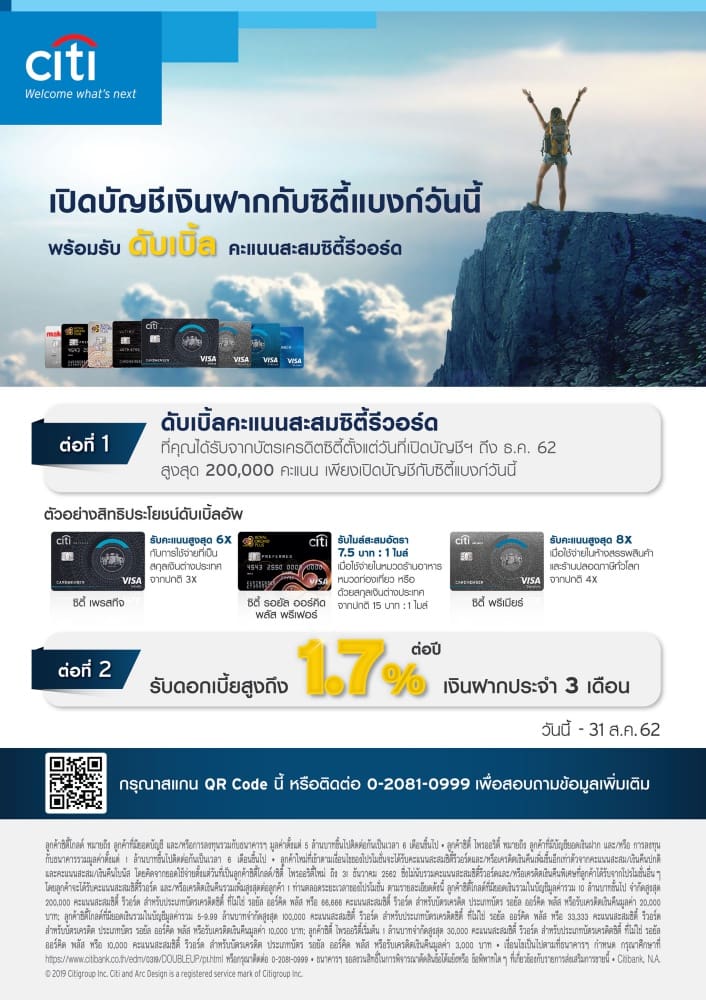 ธนาคารซิตี้แบงก์ มอบสิทธิพิเศษสำหรับการใช้งานบัตรเครดิตซิตี้ทุกประเภท (ยกเว้นบัตรเครดิตซิตี้ ซิมพลิซิตี้) รับคะแนนสะสมซิตี้รีวอร์ด เพิ่มขึ้นเท่าตัวสูงสุด 200,000 คะแนน เมื่อเปิดบัญชีใหม่กับ “ซิตี้โกลด์” หรือ “ซิตี้ ไพรออริตี้” บริการบริหารความมั่งคั่งเพื่อการลงทุนที่งอกเงย พร้อมให้คุณสนุกไปกับทุกไลฟ์สไตล์การใช้จ่ายคะแนนเหนือระดับ อาทิ ส่วนลด ของกำนัล และตั๋วเครื่องบิน จากทั้งร้านค้า ร้านอาหารชั้นนำ ที่พัก สปา บริการเสริมความงาม ฯลฯ ตอบโจทย์ทุกความบันเทิง ตลอดทั้งปี 2562 ผู้สนใจสามารถสมัครรับสิทธิประโยชน์ดังกล่าวได้ ตั้งแต่วันนี้ – 31 สิงหาคม 2562 ตรวจสอบข้อมูลโปรโมชั่นเพิ่มเติมได้ที่www.citibank.co.th/th/newcitigoldcustomer/index.htm หรือติดต่อ 02-081-0999
