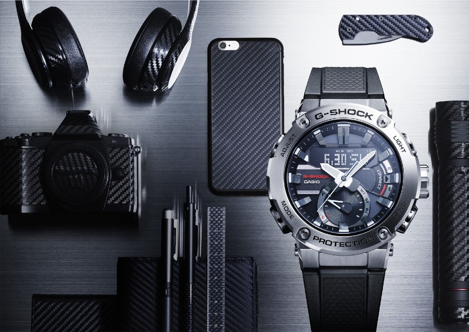 ต่อกันที่นาฬิกาตัวเรือนคาร์บอนผสมสแตนเลส สตีล อย่าง G-STEEL Carbon Core Guard รุ่น GST-B200 นาฬิกามาดเท่ มาพร้อมกับตัวเรือนทำจากคาร์บอนและกรอบสแตนเลสสตีลที่ให้ลุคสุขขุมแบบมีสไตล์ ทางด้านฟังก์ชั่นก็ไม่น้อยหน้านาฬิการุ่นอื่นที่ได้เปิดตัวไป สำหรับ G-STEEL GST-B200 มาพร้อมกับหน้าจอ LCD ที่ติดสว่างได้ในที่มืดช่วยเสริมทั้งในด้านฟังก์ชันและดีไซน์ของหน้าปัด สามารถเชื่อมต่อเข้ากับสมาร์ทโฟนได้ผ่านระบบบลูทูธ ประหยัดพลังงานด้วยระบบ Tough Solar ระบบชาร์จไฟได้ด้วยพลังแสงอาทิตย์