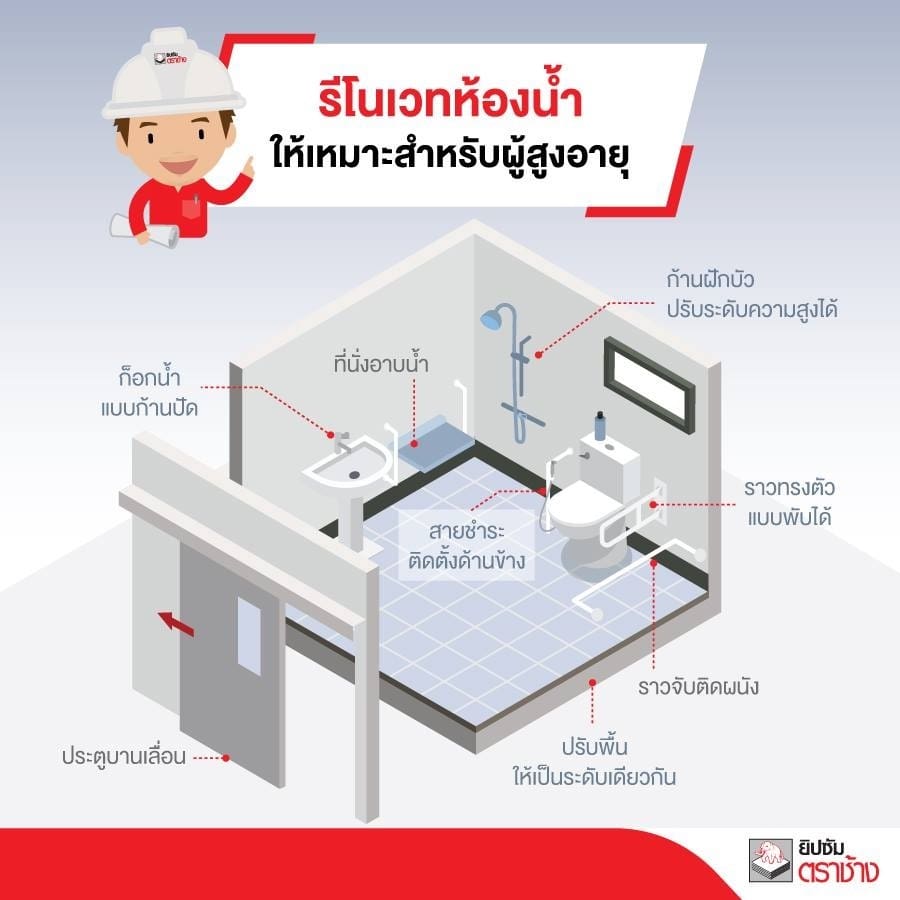 ห้องน้ำ ไม่ควรมีพื้นต่างระดับ เพราะอาจเกิดอุบัติเหตุกับผู้สูงอายุหากเกิดอาการกล้ามเนื้อหรือแขนขาอ่อนแรง พื้นผิวกระเบื้องต้องไม่ลื่นและมีค่าความฝืดที่เหมาะสม ควรติดตั้งราวจับทรงตัวบริเวณที่นั่งอาบน้ำเพื่ออำนวยความสะดวกและเพิ่มความปลอดภัย