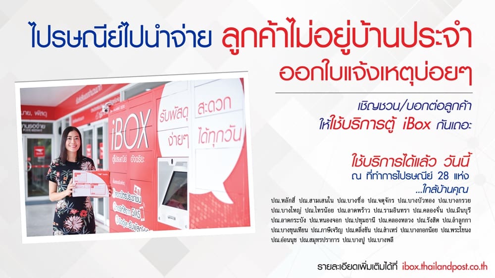 บริษัท ไปรษณีย์ไทย จำกัด (ปณท) ชวนคนไทยใช้บริการ “ตู้ไปรษณีย์อัจฉริยะ” หรือ ตู้ iBox ณ ที่ทำการไปรษณีย์ และภายในศูนย์การค้า รวม 51 แห่งทั่วกรุงเทพฯ และปริมณฑล เพื่ออำนวยความสะดวกแก่ผู้ใช้บริการให้สามารถรับพัสดุได้ตามเวลาที่ต้องการได้ โดยไม่เสียค่าใช้จ่ายเพิ่มเติม ทั้งนี้ บริการตู้ไปรษณีย์อัจฉริยะ รองรับเฉพาะสิ่งของแบบมีหลักฐาน เช่น ไปรษณีย์ด่วนพิเศษ (EMS) ไปรษณีย์แบบลงทะเบียน เป็นต้น ซึ่งจะต้องเป็นสิ่งของขนาดที่สามารถใส่ในตู้ได้เท่านั้น ทั้งนี้ ไปรษณีย์ไทย มีแผนขยาย การติดตั้งตู้ iBox ไปยังพื้นที่ต่างๆ ทั่วประเทศเร็วๆ นี้ เพื่อตอบโจทย์ไลฟ์สไตล์คนยุคใหม่ที่ไม่ค่อยอยู่บ้านและไม่สะดวกรับสิ่งของที่บ้าน