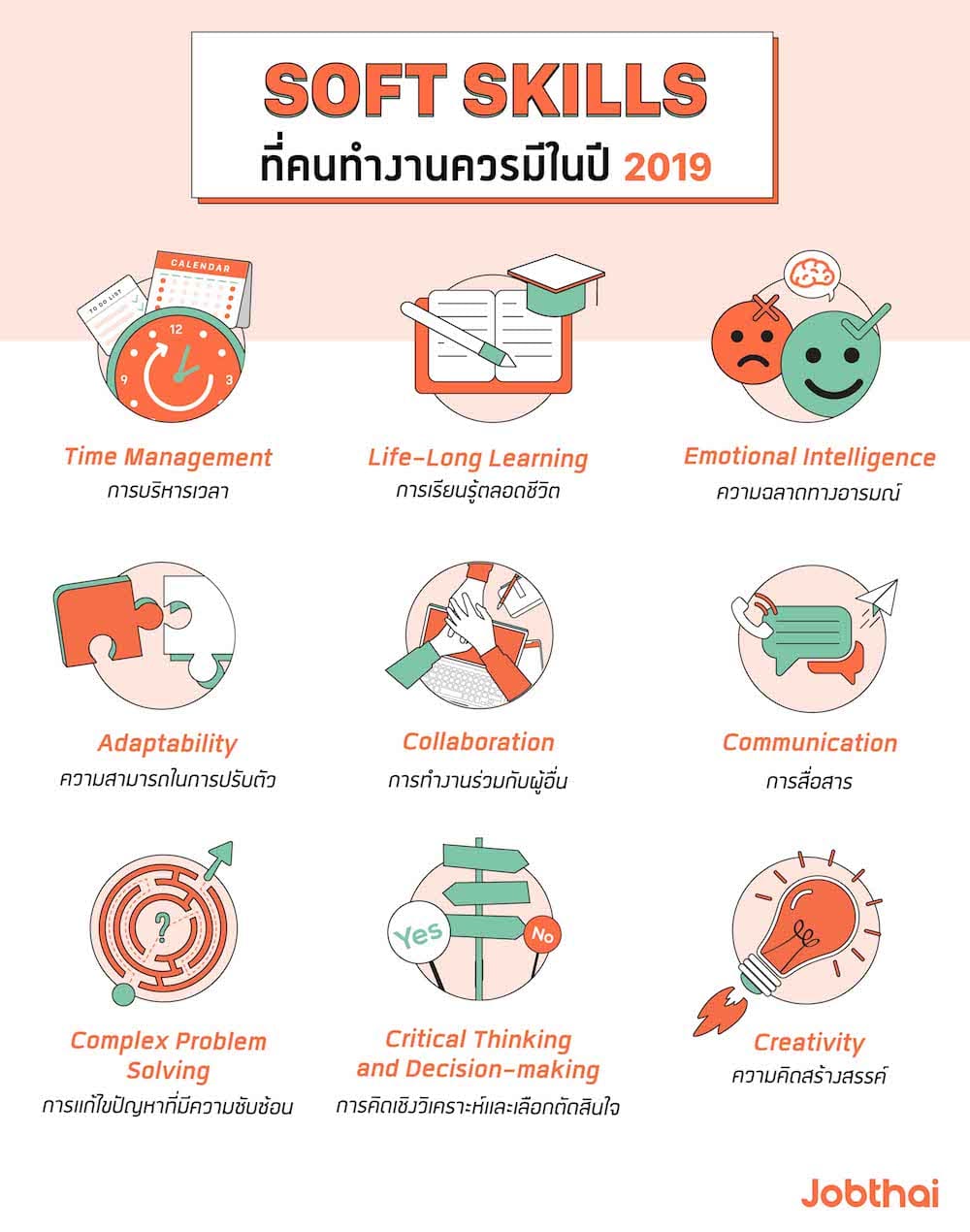 การทำงานที่ได้รับมอบหมายหรือสร้างสรรค์ผลงานออกมาได้อย่างดีเป็นไปตามเป้าหมายขององค์กรนั้น คนทำงานอย่างเราก็ต้องมีความรู้ความสามารถที่เกี่ยวข้องกับอาชีพที่เราทำอยู่ ที่เรียกกันว่า “ฮาร์ด สกิล” (Hard Skills) ซึ่งเป็นทักษะที่จะทำให้เรามีความเชี่ยวชาญในตำแหน่งงานหรืออาชีพนั้นมากขึ้นเรื่อย ๆ แต่ทักษะที่เกี่ยวกับสายงานโดยตรงอย่างเดียวนั้นอาจจะไม่เพียงพอต่อโลกการทำงานในปัจจุบัน เพราะบริษัทต่าง ๆ ยังมองไปถึง “ซอฟต์ สกิล” (Soft Skills) ของพนักงานด้วย ซึ่ง Soft Skills ก็คือทักษะที่ค่อย ๆ พัฒนามาจากการใช้ชีวิต การเข้าสังคม และการทำงาน ซึ่งเป็นทักษะที่สามารถเอาไปปรับใช้ได้ ไม่ว่าจะทำงานในสายงานไหนก็ตาม โดยวันนี้ นางสาวแสงเดือน ตั้งธรรมสถิตย์ ผู้ร่วมก่อตั้งและหัวหน้าผู้บริหารด้านปฏิบัติการของจ๊อบไทย (JobThai) ผู้ให้บริการหางาน สมัครงาน ออนไลน์ อันดับ 1 ของประเทศไทย จะมาเผย 9 Soft Skills ที่คนทำงานควรมีในปี 2019 เพื่อที่จะช่วยทำให้คุณกลายเป็นพนักงานที่โดดเด่นเข้าตาองค์กร
