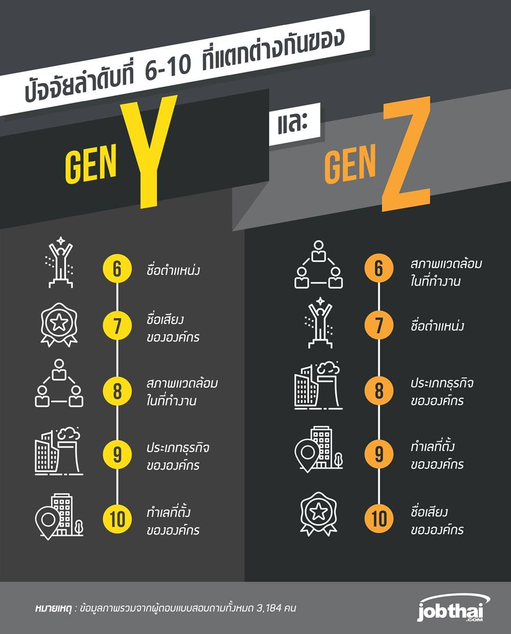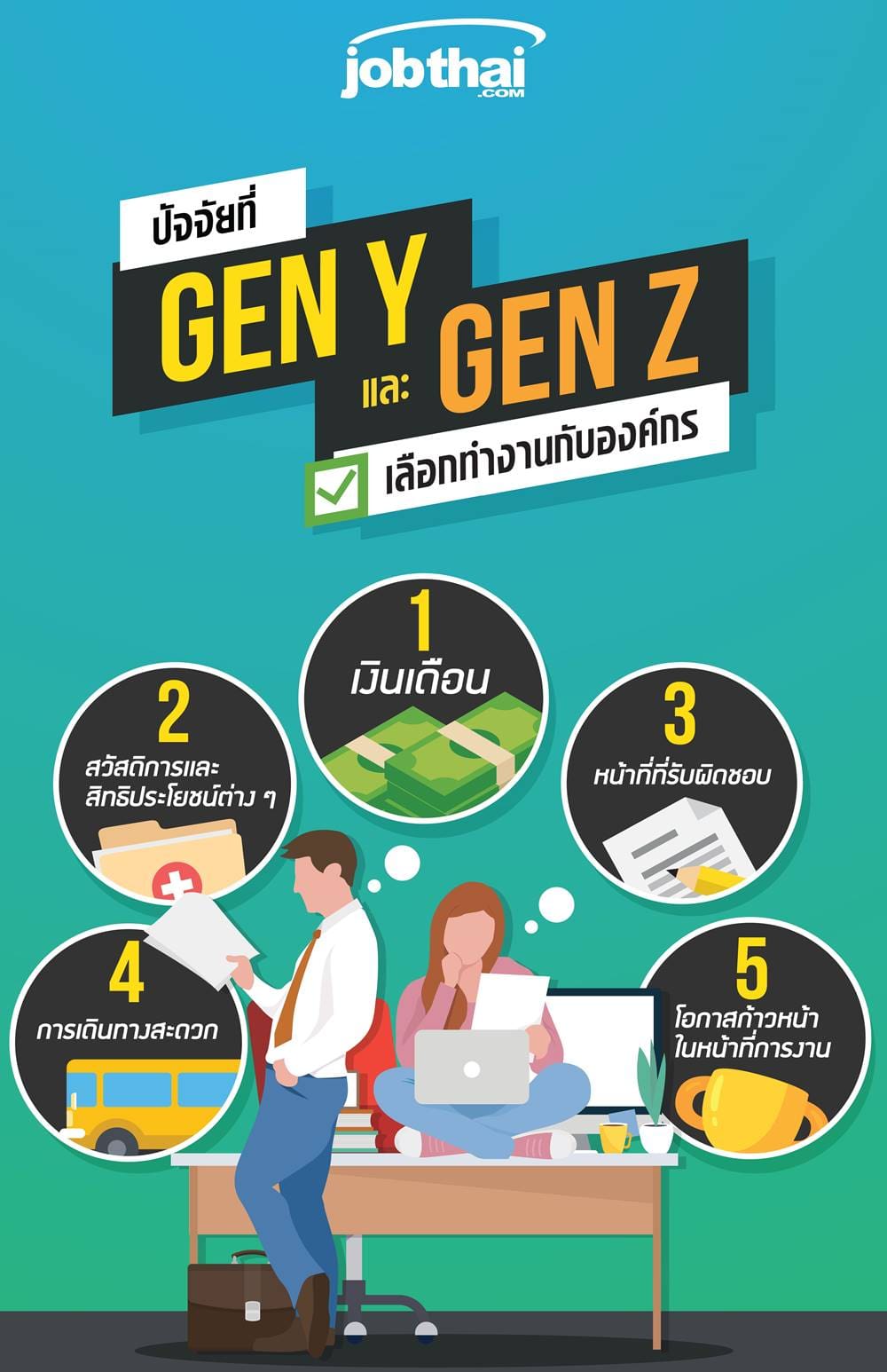 นางสาวแสงเดือน ตั้งธรรมสถิตย์ ผู้ร่วมก่อตั้งและหัวหน้าผู้บริหารด้านปฏิบัติการ เว็บไซต์จ๊อบไทยดอทคอม (JobThai.com) กล่าวว่า ในโลกการทำงานปัจจุบัน จะเห็นได้ว่ากลุ่มคน Gen Y และ Gen Z เริ่มมีบทบาทในโลกของการทำงานมากขึ้น และแน่นอนว่ากลุ่มคนเหล่านี้เริ่มจะกลายมาเป็นกำลังแรงงานหลักของหลายองค์กร ด้วยเหตุนี้ เว็บไซต์จ๊อบไทยดอทคอม ในฐานะผู้นำด้านเว็บไซต์หางาน สมัครงาน อันดับ 1 ของประเทศไทย ที่มีผู้ลงทะเบียนฝากประวัติกว่า 1.4 ล้านคน และมีจำนวนงานจากบริษัทชั้นนำกว่า 90,000 อัตรา จึงได้ทำการสำรวจความคิดเห็นของคนทำงานสองเจนเนอเรชั่น ได้แก่ Gen Y และ Gen Z โดยสำรวจกลุ่มตัวอย่างจากทั่วประเทศจำนวน 3,184 คน ในหัวข้อปัจจัยที่ใช้พิจารณาเลือกเข้าทำงานกับองค์กร พบว่ามี 5 ปัจจัยแรกที่คนทำงานทั้งสองเจนเนอเรชั่นให้ความสำคัญเหมือนกันมากที่สุด ได้แก่