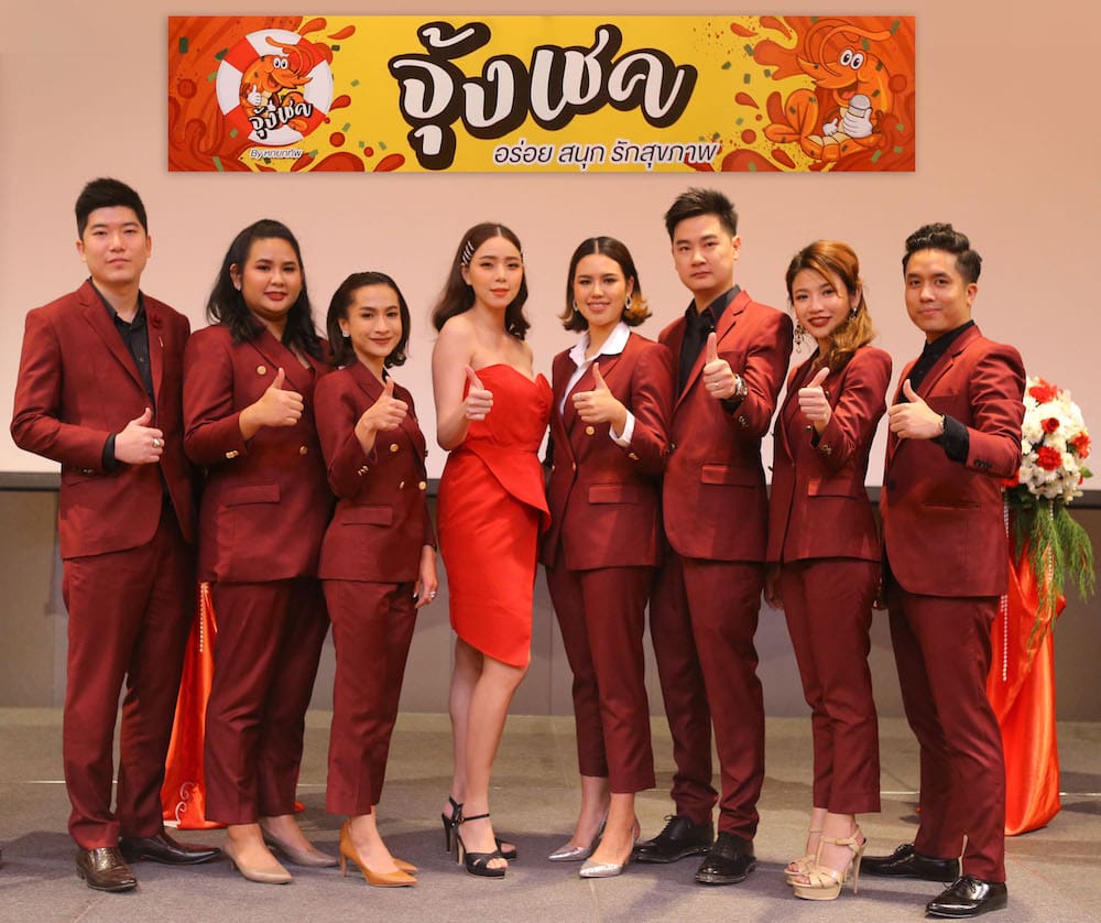 นางสาวธัญสุดา สุขภูมิ ประธานกรรมการ บริษัท หกยกทัพ กรุป จำกัด (คนที่ 5 จากซ้าย) จัดงานเปิดตัว “จุ้งเชค” แฟรนไชส์ขนมกุ้งย่าง ที่เป็นมากกว่าอาหารทานเล่น ปราศจากผงชูรสและวัตถุกันเสีย เหมาะสำหรับคนที่รักสุขภาพ สามารถสร้างรายได้ สร้างอาชีพให้คนไทย ภายใต้แนวคิด “อร่อย สนุก รักสุขภาพ” โดยมี นายนรินทร์ ลีลาภรณ์ และดาราชื่อดัง นิวเคลียร์-หรรษา กุศลมโนมัย เข้าร่วมงาน ณ โรงแรมพูลแมน แกรนด์ สุขุมวิท(อโศก) เมื่อเร็วๆ นี้