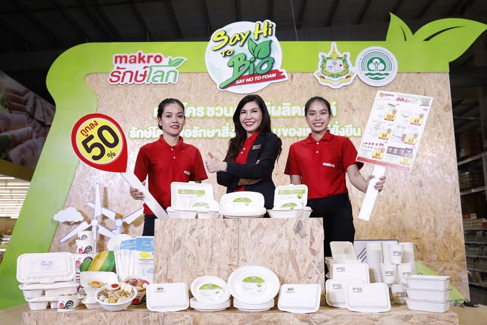 “ภายใต้โครงการ Say Hi to Bio, Say No to Foam แม็คโครจะหยุดจำหน่ายภาชนะโฟมบรรจุอาหารใน12 สาขานำร่อง เพื่อสนับสนุนผู้ประกอบการให้หันมาเลือกใช้บรรจุภัณฑ์ทางเลือกที่เป็นมิตรต่อสิ่งแวดล้อม (Eco-Friendly Products) นอกจากนี้ยังร่วมกับพันธมิตร ผลิตและพัฒนาบรรจุภัณฑ์อาหารจากวัสดุธรรมชาติ ทดแทนโฟมและพลาสติก อาทิ ผลิตภัณฑ์จากชานอ้อย เส้นใยพืช กระดาษ และเส้นใยยูคาลิปตัส จำหน่ายภายใต้ตราสินค้า aro พร้อมการจัดโปรโมชั่นราคาพิเศษ 10-40 % อย่างต่อเนื่องตลอดทั้งปีเพื่อสร้างแรงจูงใจ และพิเศษ สำหรับ 12 สาขานำร่อง ลดราคาสูงถึง 20 – 50% ในวันที่ 19 – 21 เมษายนนี้เท่านั้น”