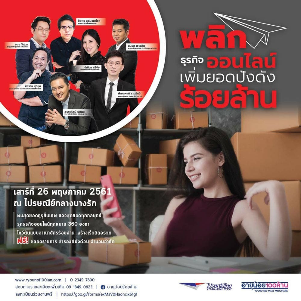 กรุงเทพฯ 9 พฤษภาคม 2561 – บริษัท ไปรษณีย์ไทย จำกัด (ปณท) ชวนผู้ค้าออนไลน์ ลับคมความคิด ในงานสัมมนา “พลิกธุรกิจออนไลน์ เพิ่มยอดปังดังร้อยล้าน” งานสัมมนาที่อัดแน่นด้วยความรู้และกลยุทธ์จากวิทยากรชั้นนำที่มีประสบการณ์ตรง จนกลายเป็นต้นแบบความสำเร็จในธุรกิจอีคอมเมิร์ซด้านต่าง ๆ นำโดย คุณวิสูตร แสงอรุณเลิศ นักสร้างแรงบันดาลใจ เจ้าของแฟนเพจ “Boy’s Thought” คุณสมยศ เชาวลิต ผู้ก่อตั้งและกรรมการผู้จัดการ บริษัท J.I.B. คุณพัฒนพงศ์ รานุรักษ์ ประธานกรรมการบริหาร และผู้ร่วมก่อตั้ง ดีวานา สปา และคุณปนิดา ศรีชัย เจ้าของร้านออนไลน์ PaniCloset เป็นต้น ที่พร้อมใจมาร่วมถ่ายทอดเคล็ดลับระดับเซียนในการทำธุรกิจสู่ความสำเร็จ ตั้งแต่การเข้าใจตลาดและแนวโน้มธุรกิจเพื่อค้นคิดไอเดียต่อยอด การสร้างแบรนด์ให้ดังและยั่งยืน ไปจนถึงการตลาดดิจิทัลเขิงรุกแบบหวังผลได้