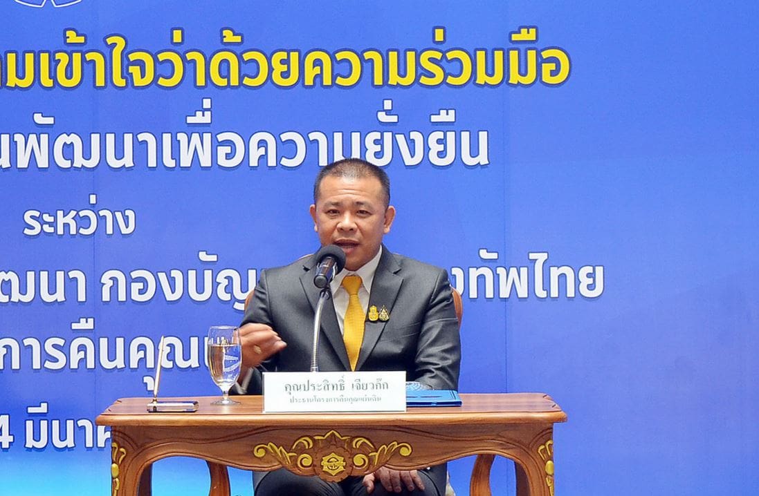 ทั้งนี้ โครงการคืนคุณแผ่นดินปฏิบัติงานมาเข้าปีที่ 10 ตามพระราชดำริของบุคคลสำคัญของประเทศ ต้องการพัฒนาแบบยั่งยืนและถาวรพร้อมกับการพัฒนาเทคโนโลยีและยกระดับของภาคประชาชนอย่างครบถ้วนครบวงจรในแบบองค์รวม จึงร่วมกับหน่วยบัญชาการทหารพัฒนา (นทพ.) จัดตั้งโครงการหมู่บ้านพัฒนาเพื่อความยั่งยืน โดยมีการศึกษาอย่างถ่องแท้เพื่อให้ประชาชนยอมรับอย่างพร้อมใจ พร้อมกับการเข้าไปดำเนินการจริงอย่างจริงใจเพื่อพัฒนาทุกกลุ่มอาชีพให้เกิดประโยชน์และพัฒนาคุณภาพชีวิตของประชาชนให้ดีขึ้นใน 5 มิติ ทั้งด้านเศรษฐกิจ สังคม สุขภาพ ความคิดสร้างสรรค์ และการศึกษา โดยมีโครงการนำร่องหมู่บ้านต้นแบบ ทั่วประเทศอยู่แล้ว จำนวน 10 หมู่บ้าน ได้แก่