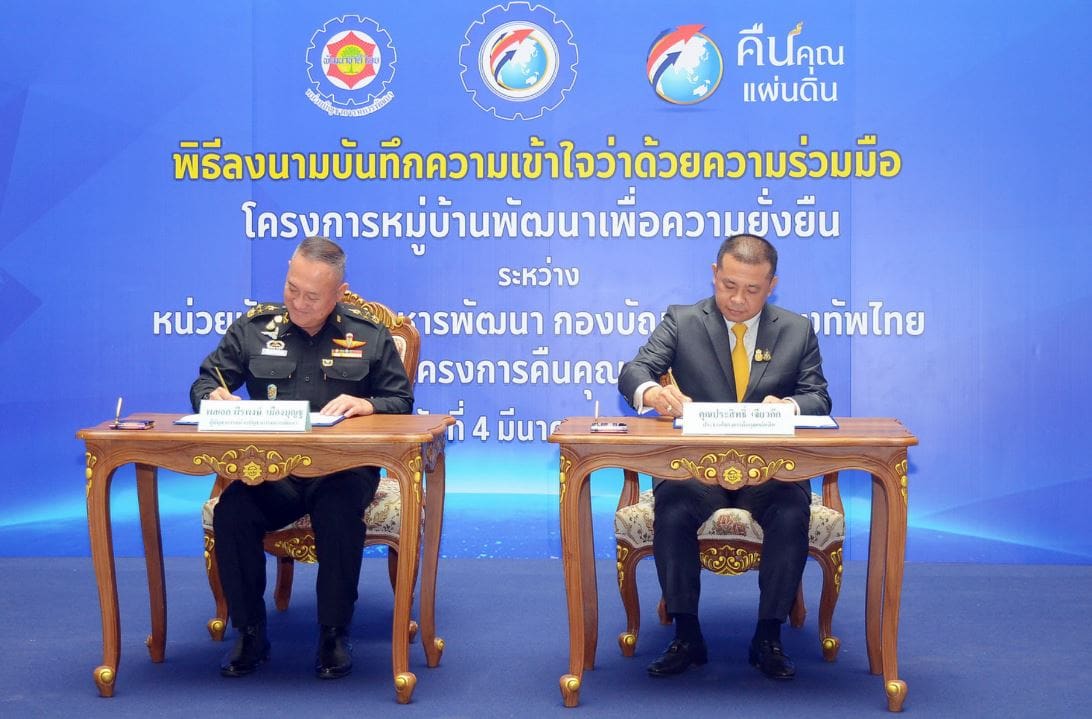 ตามที่ทางหน่วยบัญชาการทหารพัฒนา กองบัญชาการกองทัพไทย มีวัตถุประสงค์พัฒนา คน ชุมชน พื้นที่ ให้สามารถพึ่งพาตนเองได้อย่างยั่งยืน มีความสมบูรณ์แบบองค์รวมและเกื้อกูลต่อการป้องกันประเทศ ซึ่งโครงการคืนคุณแผ่นดินมีวัตถุประสงค์ช่วยเหลือพัฒนาชุมชนให้อยู่ดี กินดี ลดรายจ่าย เพิ่มรายได้ ทำให้ชุมชนเกิดความเข้มแข็ง มีความสามัคคี โดยทั้งสองหน่วยงานขับเคลื่อนด้วยอุดมการณ์เดียวกันที่ต้องการให้ประชาชนทุกคนสามารถยืนอยู่ได้ด้วยตัวเอง และเพื่อให้การดำเนินการความร่วมมือเป็นไปด้วยความเรียบร้อย หน่วยบัญชาการทหารพัฒนา และ โครงการคืนคุณแผ่นดิน จึงได้ทำพิธีลงนามบันทึกความเข้าใจว่าด้วยความร่วมมือโครงการหมู่บ้านพัฒนาเพื่อความยั่งยืนระหว่าง หน่วยบัญชาการทหารพัฒนาและโครงการคืนคุณแผ่นดิน