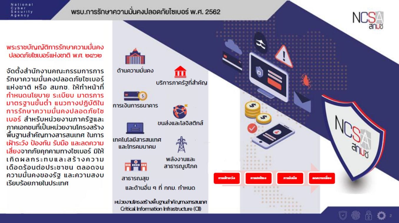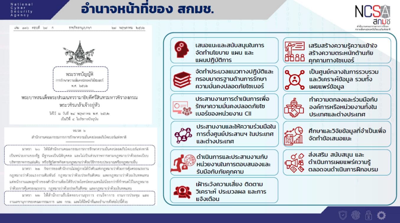 “ตามพระราชบัญญัติการรักษาความมั่นคงปลอดภัยไซเบอร์ พ.ศ. 2562 ซึ่งมีผลบังคับใช้เมื่อวันที่ 28 พฤษภาคม 2562 ให้จัดตั้งสำนักงานคณะกรรมการการรักษาความมั่นคงปลอดภัยไซเบอร์แห่งชาติ เป็นหน่วยงานของรัฐที่มีหน้าที่กำหนดนโยบาย มาตรการ แนวทางการรักษาความมั่นคงปลอดภัยไซเบอร์ สำหรับหน่วยงานภาครัฐและภาคเอกชนที่เป็นโครงสร้างพื้นฐานสำคัญทางสารสนเทศ ในการป้องกัน รับมือ และลดความเสี่ยงจากภัยคุกคามทางไซเบอร์ มิให้เกิดผลกระทบและสร้างความเดือดร้อนต่อประชาชน ตลอดจนความมั่นคงของรัฐ และความสงบเรียบร้อยภายในประเทศ ดังนั้น สกมช. จะเป็นหน่วยงานที่มีหน้าที่ปฏิบัติการ ประสานงาน สนับสนุน และให้ความช่วยเหลือ หน่วยงานที่เกี่ยวข้องในการปฏิบัติตามนโยบายและแผนว่าด้วยการรักษาความมั่นคงปลอดภัยไซเบอร์ แผนปฏิบัติการเพื่อการรักษาความมั่นคงปลอดภัยไซเบอร์ และมาตรการป้องกัน รับมือ และลดความเสี่ยงจากภัยคุกคามทางไซเบอร์ หรือตามคำสั่งของคณะกรรมการ เพื่อทำให้การป้องกันและการรับมือกับภัยคุกคามทางไซเบอร์เป็นไปอย่างมีประสิทธิภาพและยั่งยืน”