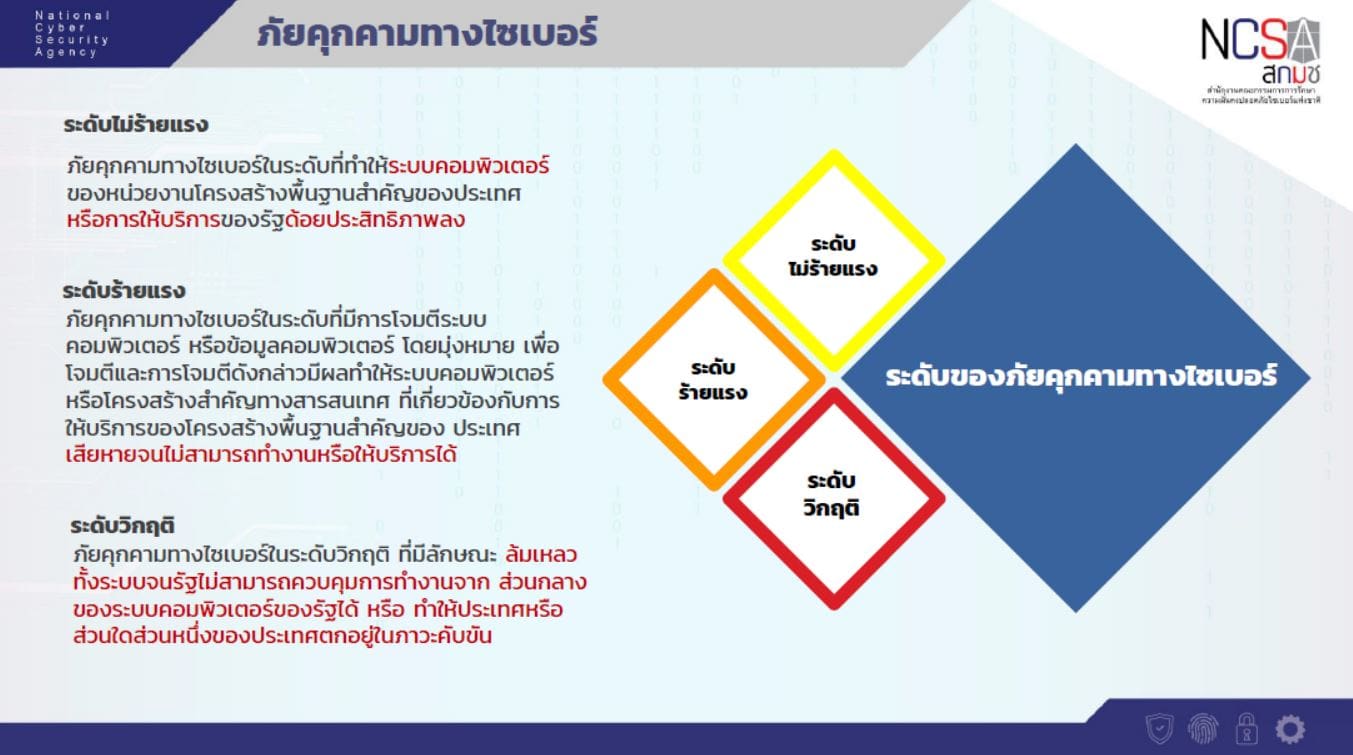 โดยแบ่งระดับภัยคุกคามทางไซเบอร์เป็น 3 ระดับ ได้แก่ ระดับไม่ร้ายแรง ระดับร้ายแรง และระดับวิกฤติ หน่วยงานของเราจะมุ่งมั่นเสนอแนะนโยบาย แผน ยุทธศาสตร์ และปรับปรุงกฎหมายที่เกี่ยวข้อง รวมทั้ง กำหนดแนวทาง มาตรฐาน มาตรการ ที่เกี่ยวข้องให้สอดคล้องกับสถานการณ์ทั้งในปัจจุบันและอนาคต ตลอดจนเผยแพร่ความรู้ความเข้าใจ และจะสนับสนุนการพัฒนาบุคลากรด้านการรักษาความมั่นคงปลอดภัยไซเบอร์ต่อไปในอนาคต”