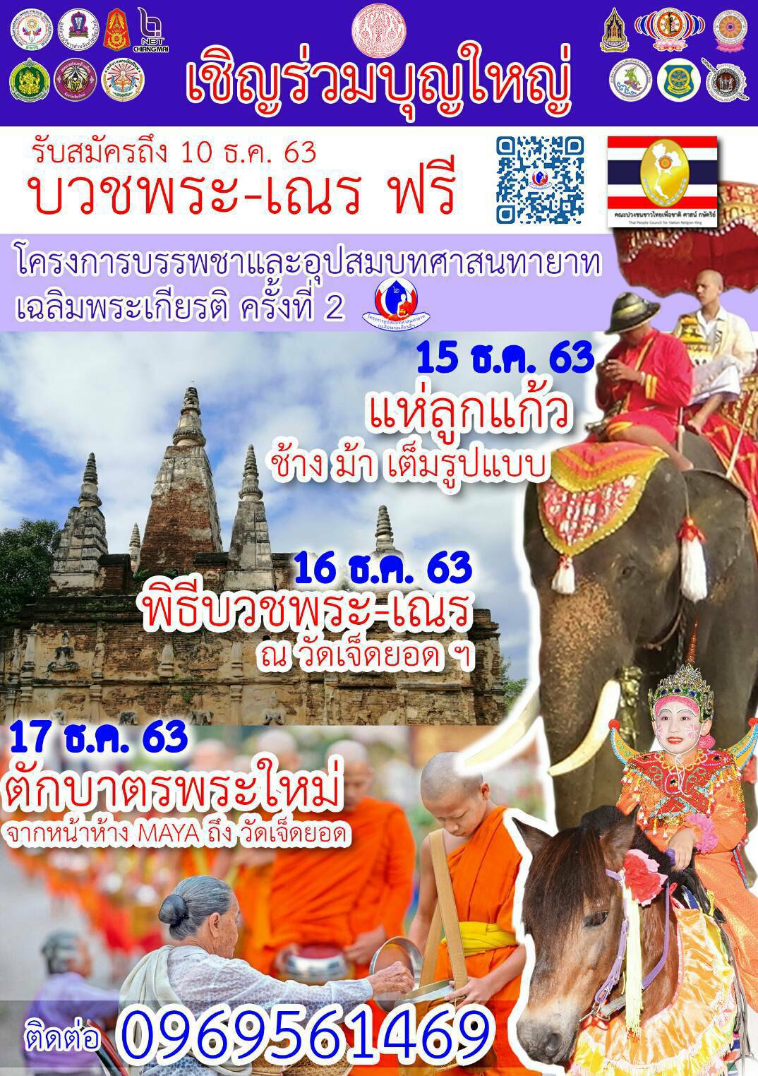 ชาวเชียงใหม่เชิญร่วมทำบุญใหญ่ กับโครงการดีๆ อย่าง “โครงการบรรพชาอุปสมบทศาสนทายาทเฉลิมพระเกียรติพระบาทสมเด็จพระวชิรเกล้าเจ้าอยู่หัวครั้งที่ ๒” เชิญชวนร่วมอุปสมบท พระ-เณร ฟรี!! โดยงานครั้งนี้จัดขึ้น โดยมีไฮไลท์ของงานคือความยิ่งใหญ่สุดอลังการของขบวนแห่ลูกแก้ว ช้าง ม้า จัดเต็มรูปแบบ ที่มีขบวนแห่ยาวเป็นระยะทางกว่า 2 กิโลเมตร เริ่มขบวนแห่ลูกแก้วจากอนุสาวรีย์สามกษัตริย์ไปยังวัดพระสิงห์วรมหาวิหาร และจากหน้าห้าง MAYA ไปตามถนนวัฒนธรรมสู่วัดเจ็ดยอด พระอารามหลวง ซึ่งเป็นศูนย์กลางพิธีของงานในครั้งนี้ ในวันที่ ๑๕ ธันวาคมนี้ และเพื่อความปลอดภัย เพิ่มความมั่นใจให้คนที่ไปร่วมงาน ทาง SKYMED ได้ตั้งเต้นท์ แจกหน้ากากอนามัยฟรีหลายจุด ร่วมกับ อสม. สาธารณสุขจังวัด มีเต้นท์คัดกรอง และสแกนผู้เข้าร่วมงานอย่างเข้มงวด งานนี้ชาวเชียงใหม่หรือใครที่มาเที่ยวเชียงใหม่ห้ามพลาด!!
