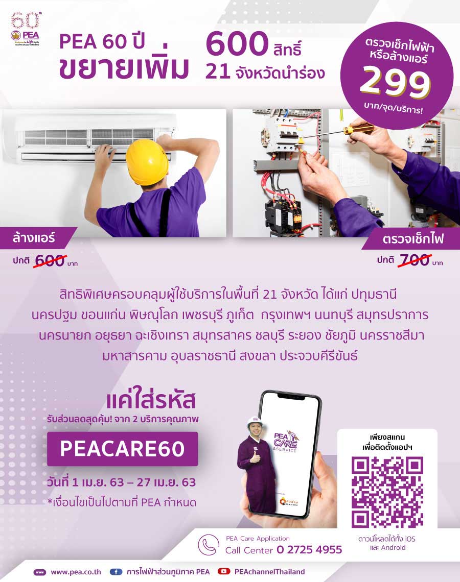 การไฟฟ้าส่วนภูมิภาค (พีอีเอ) จัดโปรโมชันฉลองครบรอบ 60 ปี ลดราคาการให้บริการตรวจเช็กระบบไฟฟ้าภายในบ้าน (เดิม 700 บาท) หรือบริการล้างเครื่องปรับอากาศ (เดิม 600 บาท) เหลือ 299 บาท ต่อจุด ต่อบริการ ในพื้นที่บริการครอบคลุม 21 จังหวัด อาทิ ปทุมธานี นครปฐม ขอนแก่น นครราชสีมา สงขลาและภูเก็ต ผู้ที่สนใจสามารถขอรับสิทธิ์ได้เพียงใส่รหัส PEACARE60 ผ่านทางแอปพลิเคชัน พีอีเอ แคร์ (PEA Care) ดาวน์โหลดฟรีทั้งระบบ Andriod และ iOS หรือสแกน QR Code ตั้งวันนี้ถึงวันที่ 27 เมษายน พ.ศ. 2563 สอบถามข้อมูลเพิ่มเติมโทร 02-725-2995