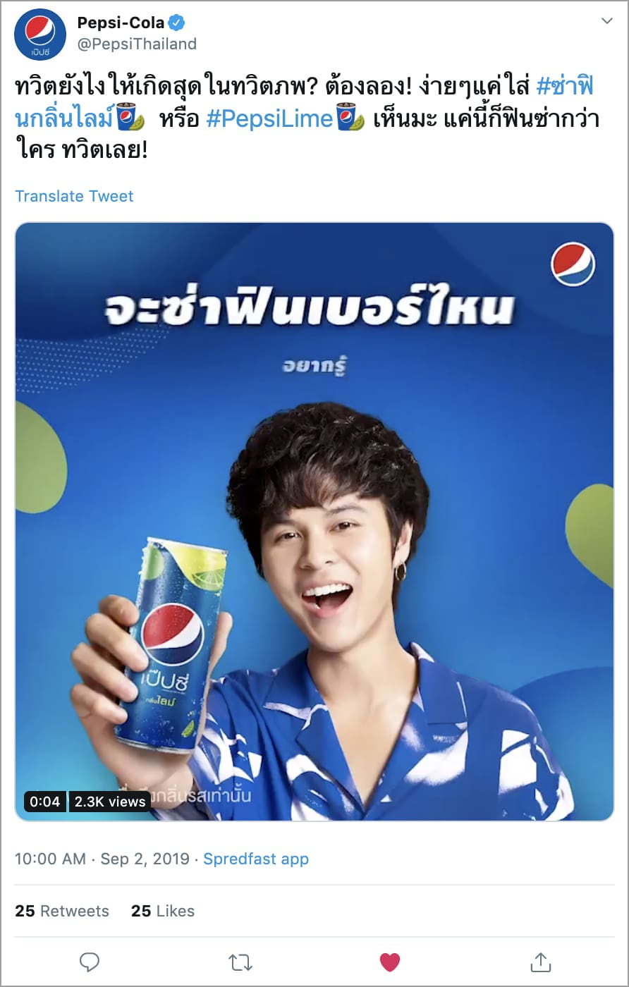 แคมเปญ #PepsiLime เฉพาะบนทวิตเตอร์ ของ PepsiCo (@PepsiThailand) จะมีถึงเดือนพฤศจิกายน 2562 นี้ หากอยากทราบว่าจะทำแคมเปญของแบรนด์ให้ประสบความสำเร็จบนทวิตเตอร์ได้อย่างไร สามารถเข้าไปดูข้อมูลได้ที่ business.twitter.com