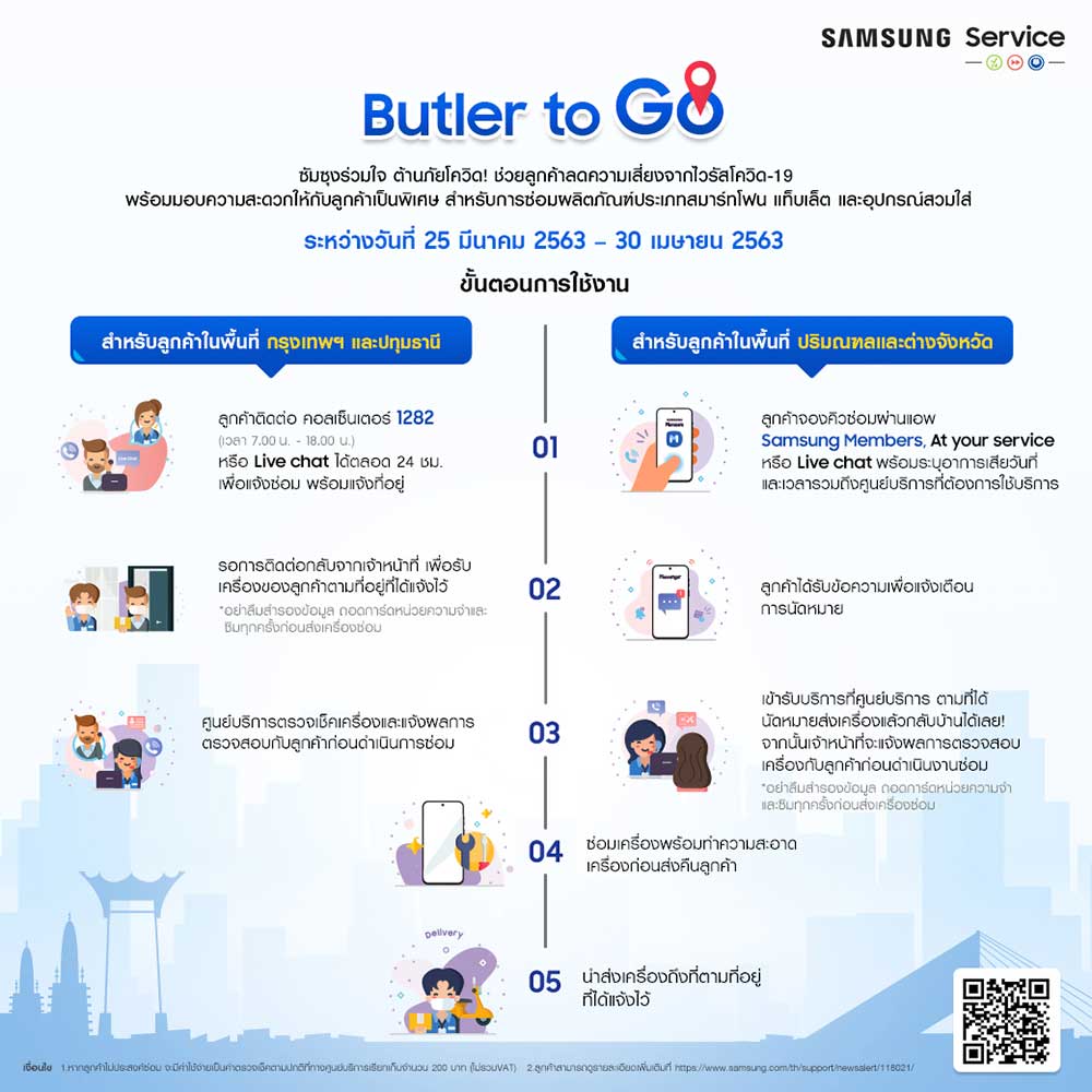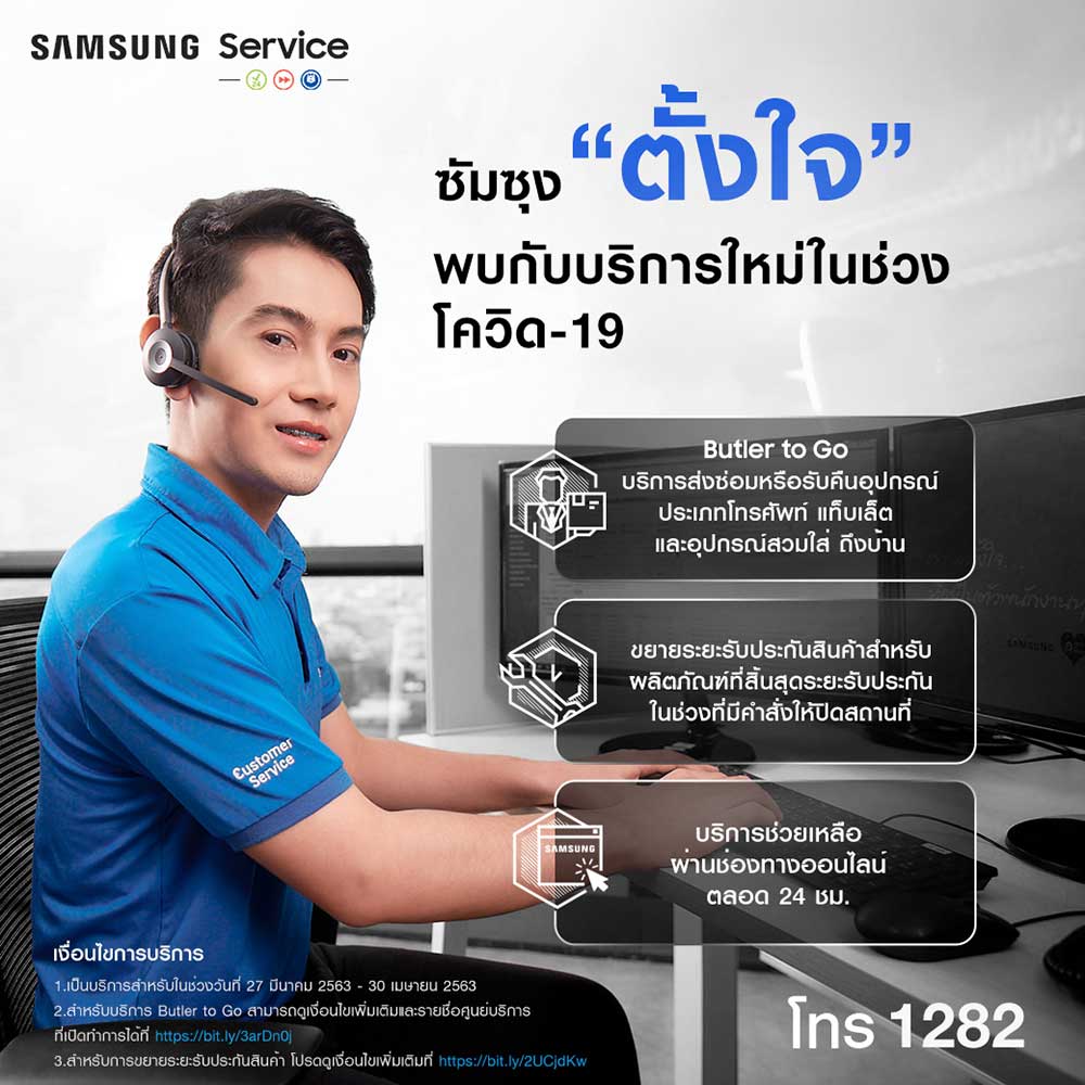 - บริการดิจิทัลเซอร์วิส เพื่ออำนวยความสะดวกให้แก่ลูกค้าที่ต้องการใช้บริการซ่อมผลิตภัณฑ์ ซัมซุงจึงได้เปิดช่องทางการติดต่อออนไลน์แก่ลูกค้าของซัมซุงและผู้ที่สนใจใช้บริการหรือต้องการข้อมูลเพิ่มเติม ไม่ว่าจะเป็นการติดต่อสอบถามผ่านทางคอลเซ็นเตอร์ของซัมซุงเบอร์ 1282 หรือผ่านทาง Live chat ที่ https://www.samsung.com/th/support/ และแอปพลิเคชัน Samsung Members เพื่อปรึกษา ผู้เชี่ยวชาญซึ่งผ่านการอบรมจากซัมซุงแล้วเป็นอย่างดีได้ตลอด 24 ชั่วโมง และตรวจสอบเงื่อนไข การรับประกันสินค้าได้ที่ https://www.samsung.com/th/support/warranty/ สามารถใช้บริการทั้ง 3 ของซัมซุงได้ตั้งแต่วันนี้ จนถึงวันที่ 30 เมษายน 2563 นี้!