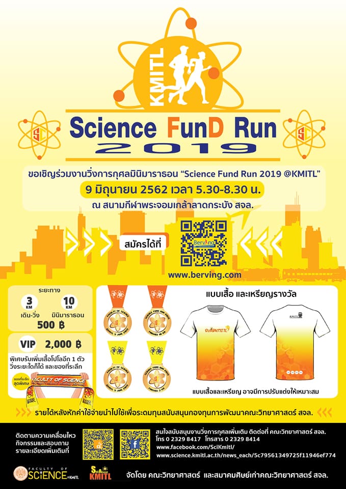 ผู้สนใจสามารถสมัครได้ตั้งแต่วันนี้ จนถึงวันที่ 30 เมษายน 2562 ที่ www.berving.com/event/science-fund-run-2019-kmitl ติดตามรายละเอียดเพิ่มเติมได้ 02 – 329 – 8414 หรือ www.science.kmitl.ac.th