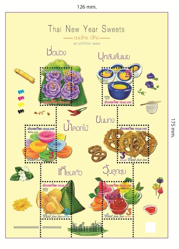 บริษัท ไปรษณีย์ไทย จำกัด (ปณท) เปิดตัวตราไปรษณียากรชุด “ปีใหม่ 2562” นำเสนอในซีรี่ส์ขนมไทยต่อจากปี 2561 ด้วยภาพ “ขนมมงคล 6 ชนิด” ที่มีสีสันสวยงาม น่ารับประทาน และนิยมทำด้วยความปราณีตสำหรับประกอบในงานหรือพิธีมงคลต่างๆ เพื่อสื่อแทนการส่งความสุขอันหอมหวานให้แก่กันในช่วงเทศกาลแห่งความสุข อย่าง ขนมน้ำดอกไม้ ขนมกง เทียนแก้ว วุ้นลูกชุบ ช่อม่วง และบุหลันดั้นเมฆ โดยขนมดังกล่าว ถือเป็นขนมที่ช่วยสร้างความประทับใจแรกเห็นให้แก่ผู้รับ พร้อมแฝงเสน่ห์ความเป็นไทยที่ควรค่าแก่การอนุรักษ์ โดยแสตมป์ชุดดังกล่าวจำหน่ายในราคาแผ่นละ 42 บาท (คละแบบ 6 ดวง) โดยแบ่งเป็นแสตมป์ชนิดราคา 3 บาท 4 แบบ และชนิดราคา 15บาท 2 แบบ และซองวันแรกจำหน่ายราคา 56 บาท