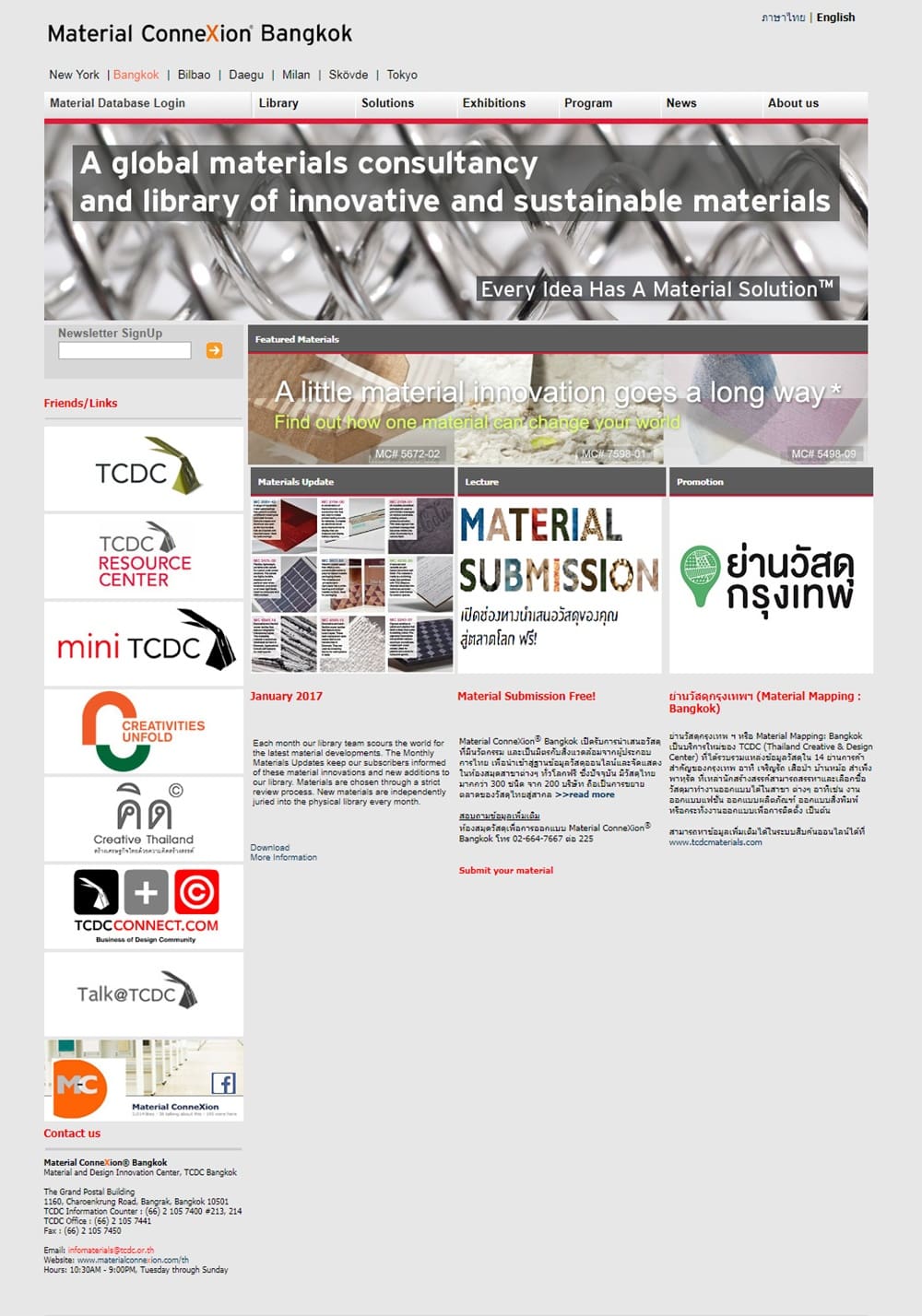 ศูนย์สร้างสรรค์งานออกแบบ (TCDC) เปิดฟังก์ชั่น ศูนย์นวัตกรรมด้านวัสดุและการออกแบบ (Material & Design Innovation Center) เปิดช่องทางการนำวัสดุไทยไปสู่ตลาดโลก (Material Submission) โดยเปิดรับการนำเสนอวัสดุที่มีนวัตกรรม ความคิดสร้างสรรค์และเป็นมิตรกับสิ่งแวดล้อมจากผู้ประกอบการไทย โดยข้อมูลดังกล่าวจะนำเข้าสู่ฐานข้อมูลวัสดุออนไลน์ของแมททีเรียล คอนเนคชัน (Material ConneXion®) ที่ใหญ่ที่สุดแห่งหนึ่งในโลก รวมถึงนำไปจัดแสดง ณ ต่างประเทศ อาทิ สหรัฐอเมริกา อิตาลี และเกาหลีใต้ เพื่อเพิ่มโอกาสในการส่งออกวัสดุไปสู่ผู้ผลิตทั่วโลก เช่นเดียวกับผ้าใยกัญชงหรือผ้าเฮมพ์และสิ่งทอไหมไทย วัสดุจากเมืองไทย และผู้ประกอบการไทยที่สามารถสร้างรายได้กว่า 26 ล้านบาทต่อปี จากการส่งออกไปยังแบรนด์ชั้นนำของโลก