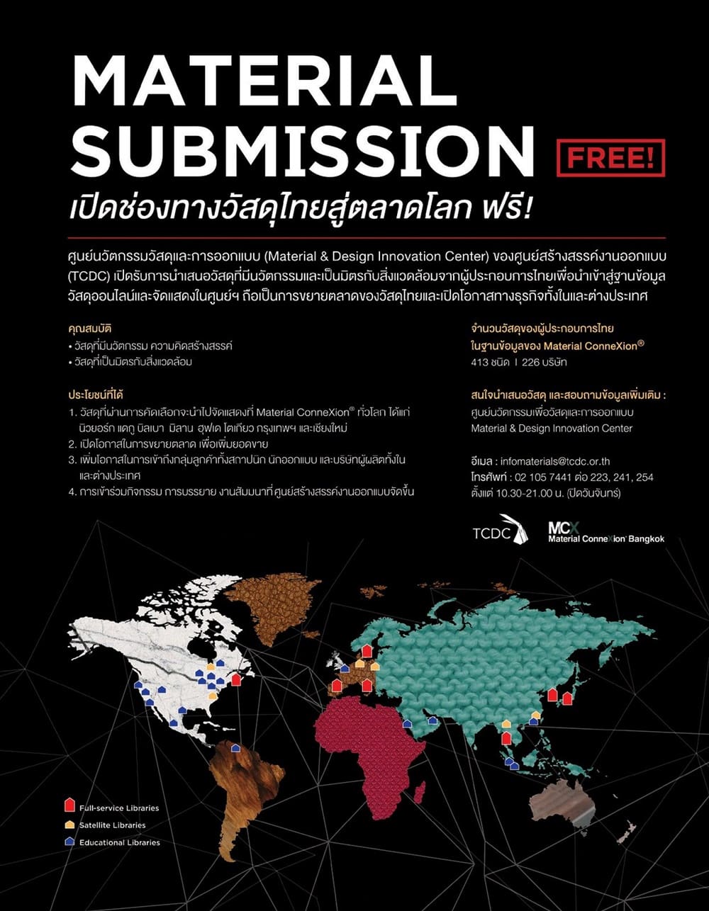 สอบถามข้อมูลเพิ่มเติมติดต่อ ศูนย์นวัตกรรมด้านวัสดุและการออกแบบ (Material & Design Innovation Center) ณ ศูนย์สร้างสรรค์งานออกแบบ (TCDC) 1160 อาคารไปรษณีย์กลาง ถนนเจริญกรุง แขวงบางรัก เขตบางรัก กรุงเทพฯ 10501 โทรศัพท์ 02-105-7400 ต่อ 213,214 อีเมล [email protected] ตั้งแต่ 10.30 – 21.00 น. (ปิดวันจันทร์)