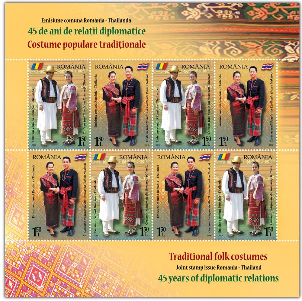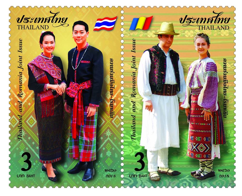 บริษัท ไปรษณีย์ไทย จำกัด (ปณท) เปิดตัวตราไปรษณียากรชุด “ความร่วมมือไทย-โรมาเนีย” ในโอกาสครบรอบ 45 ปี ของการสถาปนาความสัมพันธ์ทางการทูต นำเสนอภาพเครื่องแต่งกายแบบภูไท ทั้งแบบชายและหญิง ที่มีจุดเด่นในเรื่องการทอและลวดลายบนเสื้อผ้าย้อมครามเข้มหรือสีดำ และ ชุดประจำชาติแบบพื้นเมืองดั้งเดิม (Oltenia) เครื่องแต่งกายทางตอนใต้ของประเทศโรมาเนีย มีลายก้นหอยบนเสื้อหนังแกะ ซึ่งได้รับแรงบันดาลใจจากลายเครื่องปั้นดินเผาในยุคหินใหม่ของชุมชนในประเทศโรมาเนีย อันสะท้อนถึงวัฒนธรรมการแต่งกายท้องถิ่นอันโดดเด่นของสองประเทศ โดยแสตมป์ของประเทศไทย จำหน่ายในชนิดราคา 3 บาท (2 แบบ) และซองวันแรกจำหน่ายราคา 15 บาท