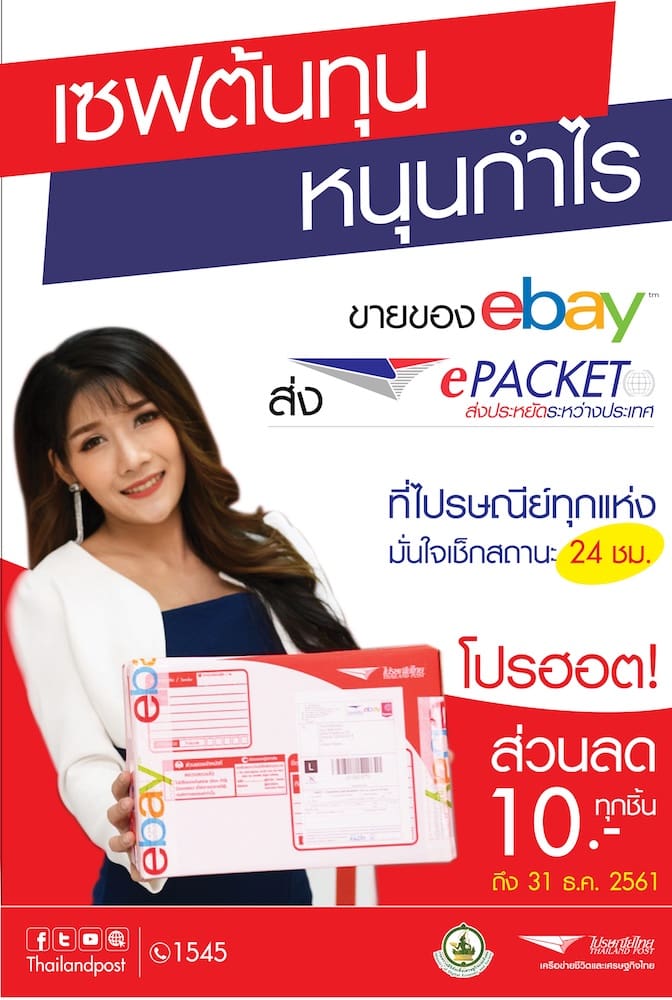บริษัท ไปรษณีย์ไทย จำกัด (ปณท) ชูบริการน้องใหม่ ePacket ส่งพัสดุราคาประหยัด เช็คสถานะได้ นำร่องประเทศปลายทางยอดนิยม 12 ประเทศ เชื่อมโปรแกรมส่งสินค้าไปต่างแดน ผ่านแพลตฟอร์มอีเบย์ ซีพาส (SEAPaSS) ให้เข้าถึงบริการส่งทั่วโลกแบบลงทะเบียน เพื่อส่งเสริมผู้ค้าออนไลน์ขายของผ่านอีเบย์ พร้อมเปิดโปรโมชั่นรับส่วนลด 10 บาททุกชิ้นจนถึงสิ้นปี 2561 ใช้บริการได้ ณ ที่ทำการไปรษณีย์ทุกแห่งทั่วประเทศ ทั้งนี้ ผู้สนใจสามารถตรวจสอบอัตราค่าบริการแต่ละประเทศปลายทาง และรายละเอียดเพิ่มเติมได้ที่ www.thailandpost.co.th หรือสอบถาม THP Contact Center 1545