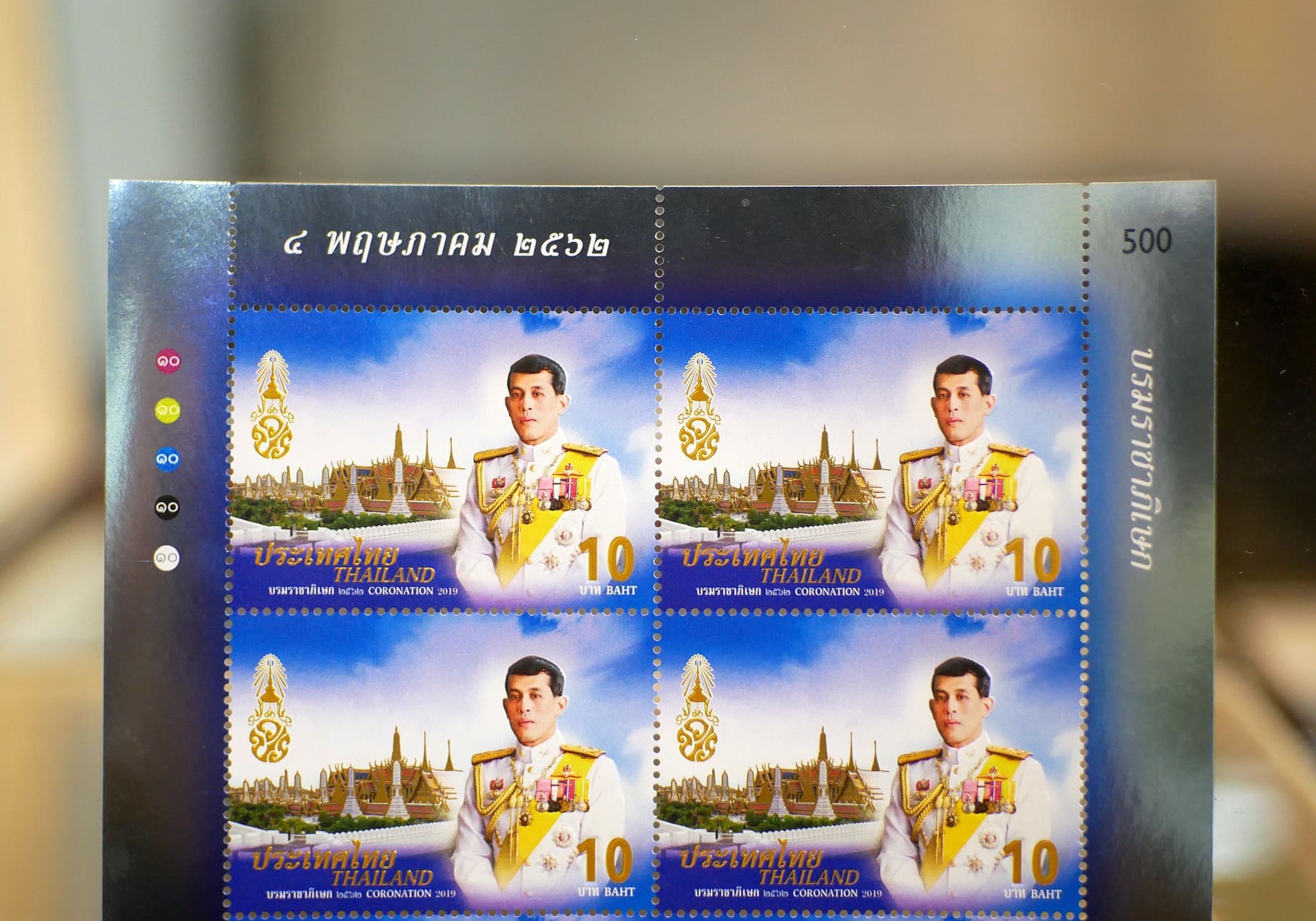 ความพิเศษของตราไปรษณียากรประวัติศาสตร์ชุดนี้ คือ การใช้เทคนิคพิเศษพิมพ์ 5 สี คือ ฟ้า เหลือง แดง ดำ และขาว ลงบนฟอยล์กระจกเป็นครั้งแรกของไทยและของโลก ซึ่งมีคุณสมบัติพิเศษที่จะทำให้ภาพตราไปรษณียากรมีความสดใส เพิ่มความสวยงามแวววาวให้แก่ภาพบนดวงแสตมป์ พร้อมทั้งการพิมพ์สีทองปั๊มดุนนูนที่อักษรพระปรมาภิไธย ว.ป.ร. ปั๊มดุนนูนบริเวณพระฉายาลักษณ์ พิมพ์สีทองปั๊มดุนนูนที่คำว่า “ประเทศไทย THAILAND” และตัวเลข 10 พิมพ์สีขาวคำว่า “บรมราชาภิเษก ๒๕๖๒ CORONATION 2019, บาทBAHT” และพิมพ์ลายเส้นสีทองบริเวณพระปรางค์ เจดีย์ ทั้งนี้ เพื่อให้ตราไปรษณียากรดังกล่าว มีความสวยงามสมพระเกียรติมากที่สุด โดยจัดพิมพ์ทั้งสิ้น 3 ล้านดวง