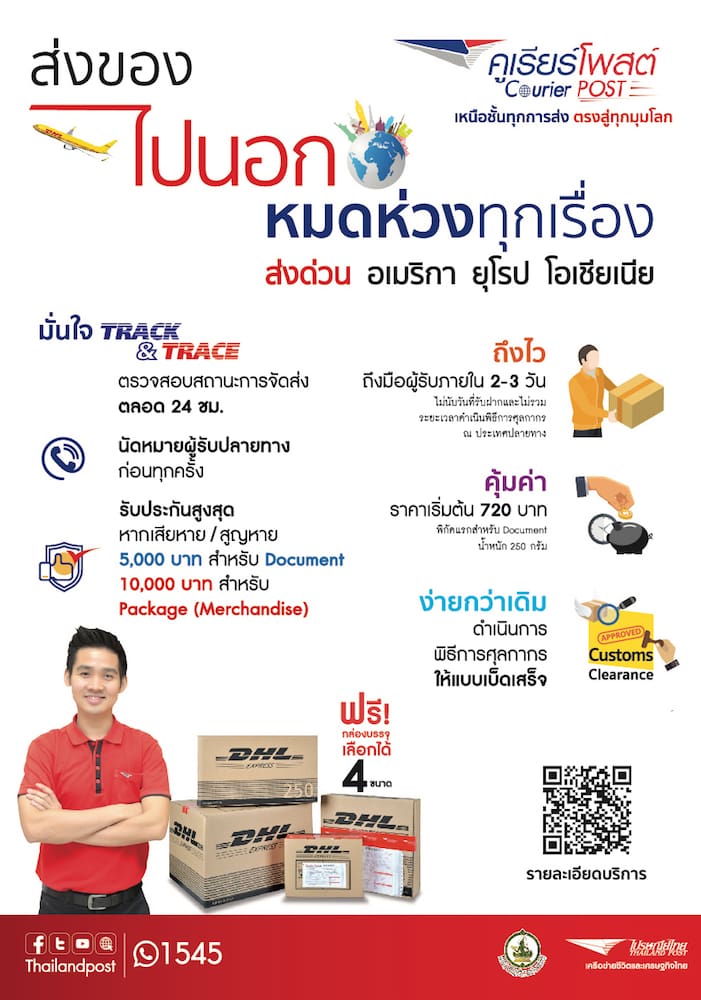 นอกจากนี้ ยังมี Courier Post อีกหนึ่งบริการระดับพรีเมี่ยมที่พัฒนาขึ้นภายใต้สโลแกน “เหนือชั้นทุกการส่ง ตรงสู่ทุกมุมโลก” เพิ่งเปิดให้บริการเมื่อต้นเดือน พ.ค.นี้ โดยร่วมมือกับพันธมิตรสำคัญคือ ดีเอชแอล เอ็กซเพรส หนึ่งในผู้นำบริการส่งด่วนมาตรฐานโลก โดยให้บริการส่งด่วนทั่วโลกภายใน 2-3 วันแก่ผู้ค้าออนไลน์ พร้อมดำเนินการด้านพิธีการศุลกากร ณ ประเทศปลายทางแบบเบ็ดเสร็จ ตลอดจนการรับประกันกรณีสิ่งของสูญหายและเสียหาย
