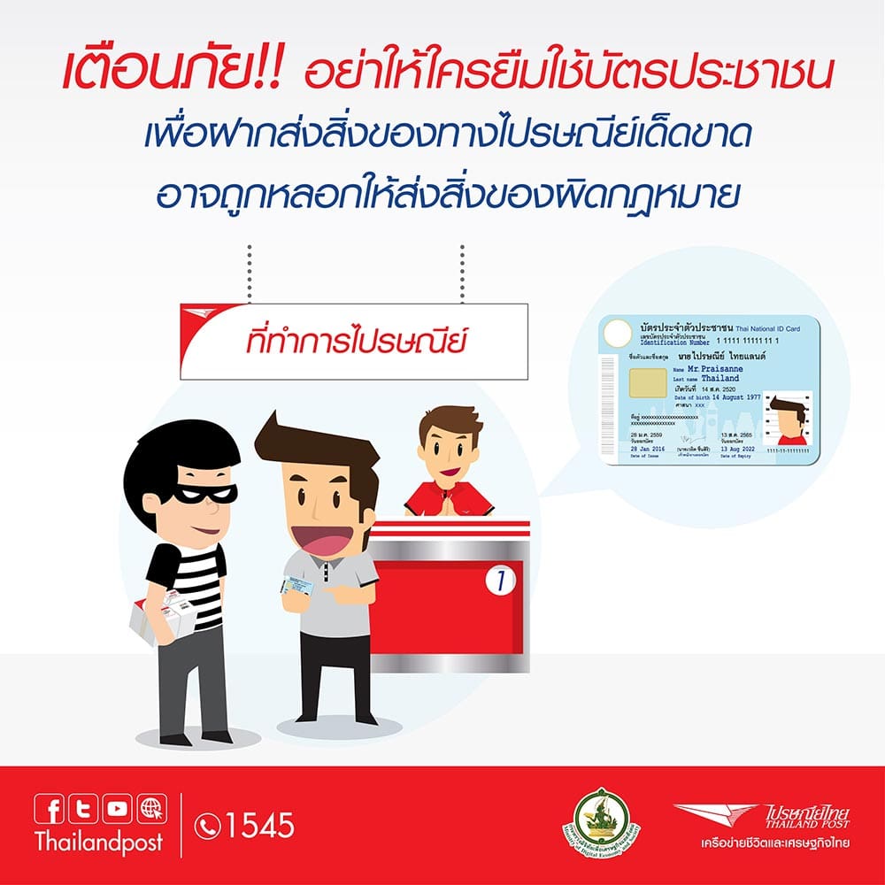 นางสมร เทิดธรรมพิบูล กรรมการผู้จัดการใหญ่ บริษัท ไปรษณีย์ไทย จำกัด (ปณท) กล่าวว่า บริษัท ไปรษณีย์ไทย จำกัด แจ้งเตือนประชาชนกรณีฝากส่งสิ่งของทางไปรษณีย์ อย่าให้บุคคลแปลกหน้ายืมบัตรประชาชนเพื่อฝากส่งสิ่งของทางไปรษณีย์ เพื่อป้องกันกรณีผู้กระทำผิดลักลอบส่งสิ่งของผิดกฎหมายผ่านเส้นทางไปรษณีย์ และหลบเลี่ยงการตรวจค้นจากเจ้าหน้าที่ อาทิ การส่งสิ่งเสพติด การส่งอาวุธ เป็นต้น โดยประชาชนผู้ใช้บริการฝากส่งไปรษณีย์ทุกคนต้องแสดงบัตรประจำตัวประชาชน หรือบัตรอื่นที่มีเลขประจำตัวประชาชน หรือหนังสือเดินทาง (กรณีเป็นชาวต่างประเทศ) ทุกครั้งก่อนการฝากส่งสิ่งของทางไปรษณีย์ทุกประเภท ซึ่งเริ่มประกาศใช้กฎดังกล่าวตั้งแต่วันที่ 8 เมษายน 2559 เป็นต้นมา ณ ที่ทำการไปรษณีย์ทุกแห่งทั่วประเทศ ทั้งนี้ หากผู้ใช้บริการไม่ได้เตรียมหลักฐานประจำตัวมาในขณะฝากส่ง ไปรษณีย์ไทย มีความจำเป็นต้องขอปฏิเสธการรับฝาก จนกว่าจะมีหลักฐานมาแสดงต่อเจ้าหน้าที่เพื่อดำเนินการฝากส่งสิ่งของเข้าสู่ระบบไปรษณีย์ต่อไป