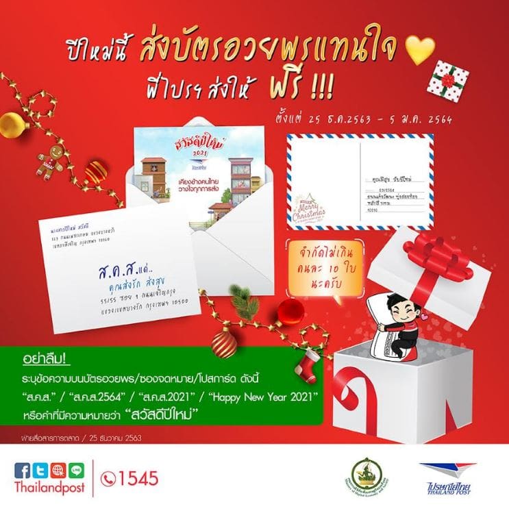 บริษัท ไปรษณีย์ไทย จำกัด (ปณท) ขอเป็นส่วนหนึ่งในการส่งต่อกำลังใจถึงกันในช่วงเทศกาลปีใหม่ที่โรคโควิด-19 กลับมาระบาดอีกครั้ง ด้วยการส่งบัตรอวยพร โปสการ์ด หรือ ส.ค.ส. โดยไม่คิดค่าบริการ เพียงจ่าหน้าซองจดหมาย การ์ดอวยพร หรือโปสการ์ดว่า “ส.ค.ส.” “ส.ค.ส. 2564” “ส.ค.ส.2021” หรือคำที่มีความหมายว่า “สวัสดีปีใหม่” ทั้งภาษาไทย และภาษาอังกฤษ สิทธิพิเศษนี้ขอมอบให้แก่ประชาชนทั่วไป (ไม่รวมนิติบุคคล หรือ หน่วยงานภาครัฐ และภาคธุรกิจเอกชน) จำกัดจำนวนไม่เกินคนละ 10 ฉบับ