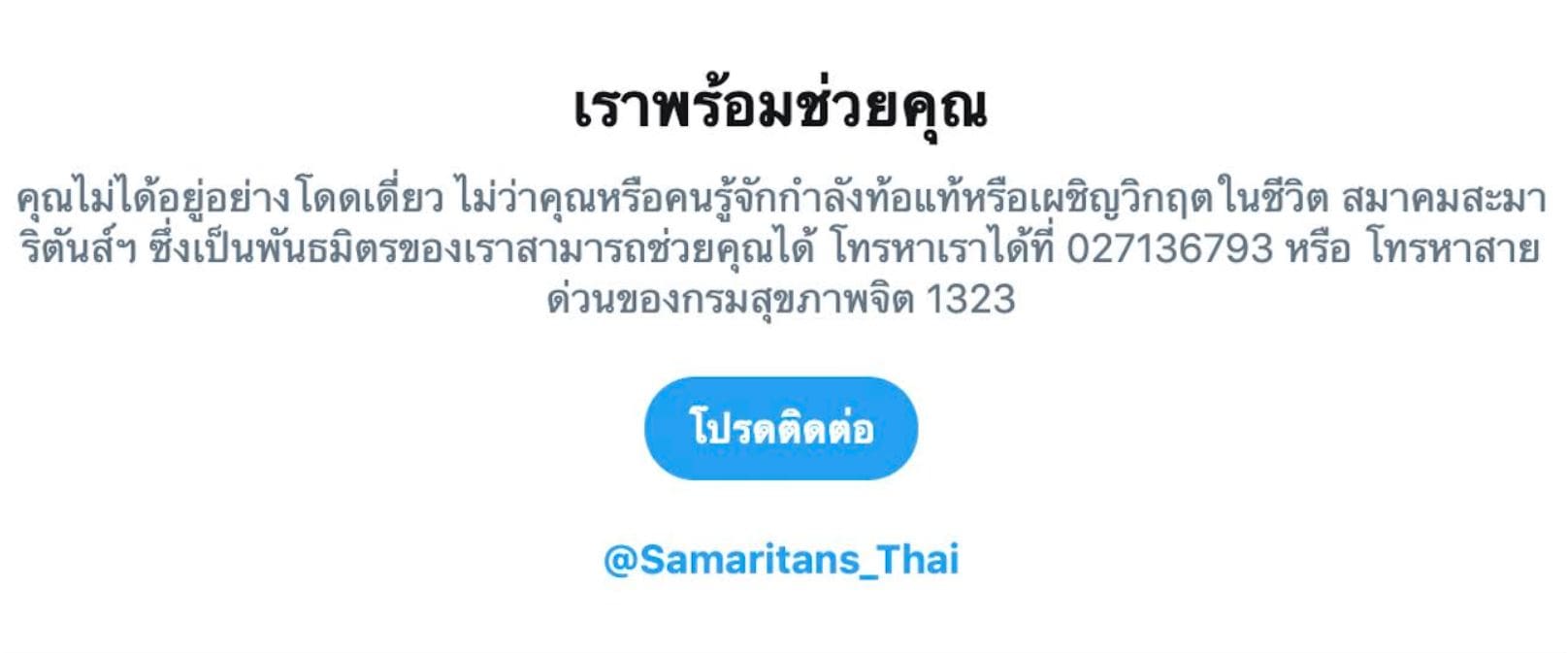 เมื่อมีการค้นหาคำที่เกี่ยวข้องกับคำว่า “ฆ่าตัวตาย” หรือ “ทำร้ายตนเอง” บนทวิตเตอร์ในประเทศไทย โดยจะมีการแจ้งเตือนเป็น ภาษาไทยปรากฎในผลการค้นหาเพื่อเป็นการทำให้กลุ่มผู้มีความเสี่ยงกล้าขอความช่วยเหลือ โดยในการแจ้งเตือนจะมีเบอร์ติดต่อ ของสมาคมสะมาริตันส์แห่งประเทศไทย (@Samaritans_Thai) และเบอร์ติดต่อสายด่วนของกรมสุขภาพจิต (@PR_dmh)