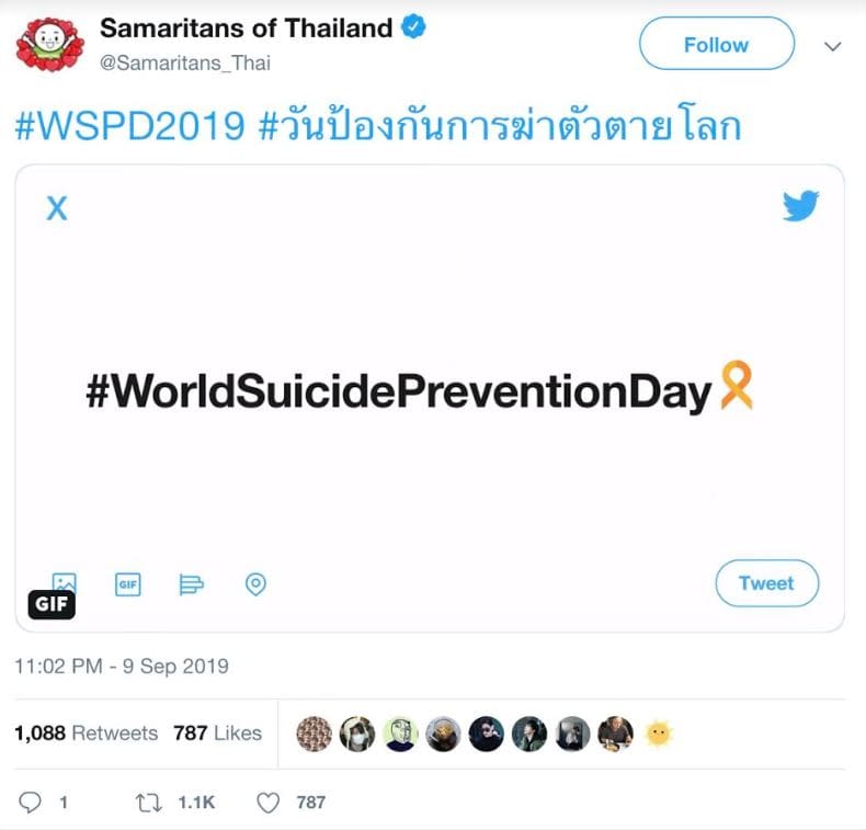 ทวิตเตอร์ ร่วมมือกับ สมาคมสะมาริตันส์แห่งประเทศไทย (@Samaritans_Thai) เปิดตัว บริการแจ้งเตือน #ThereIsHelp เพื่อป้องกันการฆ่าตัวตายและการทำร้ายตนเองในประเทศไทย สืบเนื่องในจากวันสุขภาพจิตโลก