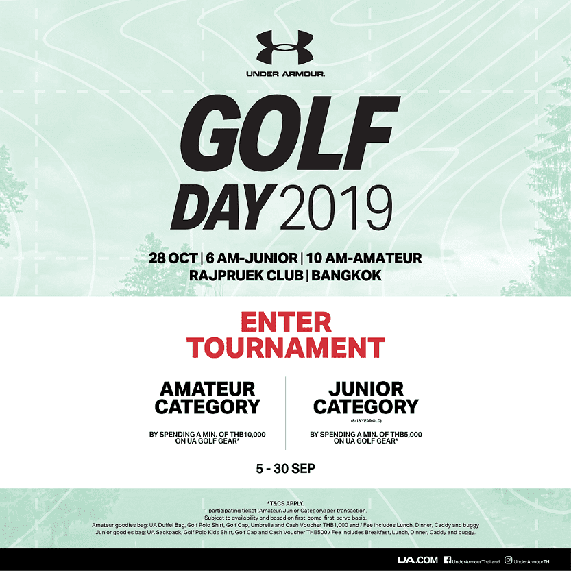 สัมผัสประสบการณ์ที่มีแค่แฟนนักกอล์ฟของ อันเดอร์ อาร์เมอร์ ที่สามารถเข้าร่วมได้ เพียงซื้อสินค้าในหมวด UA Golf ครบทุก 10,000 บาท รับหนึ่งสล็อตเพื่อเข้าร่วม UA Golf Day 2019 และพิเศษสำหรับน้องเยาวชน เพียงซื้อสินค้าครบ 5,000 บาท รับหนึ่งสล็อตเพื่อเข้าร่วม Junior Golf สล็อตมีจำนวนจำกัดเท่านั้น โดยนอกเหนือจากนักกอล์ฟที่เข้าร่วมงานจะได้รับประสบการณ์สุดพิเศษแล้ว ยังจะได้รับ Exclusive Goodie Bag ที่รวบรวมสินค้าสำหรับนักกอล์ฟระดับพรีเมี่ยมจากอันเดอร์ อาร์เมอร์ มูลค่ากว่า 8,000 บาท อีกด้วย