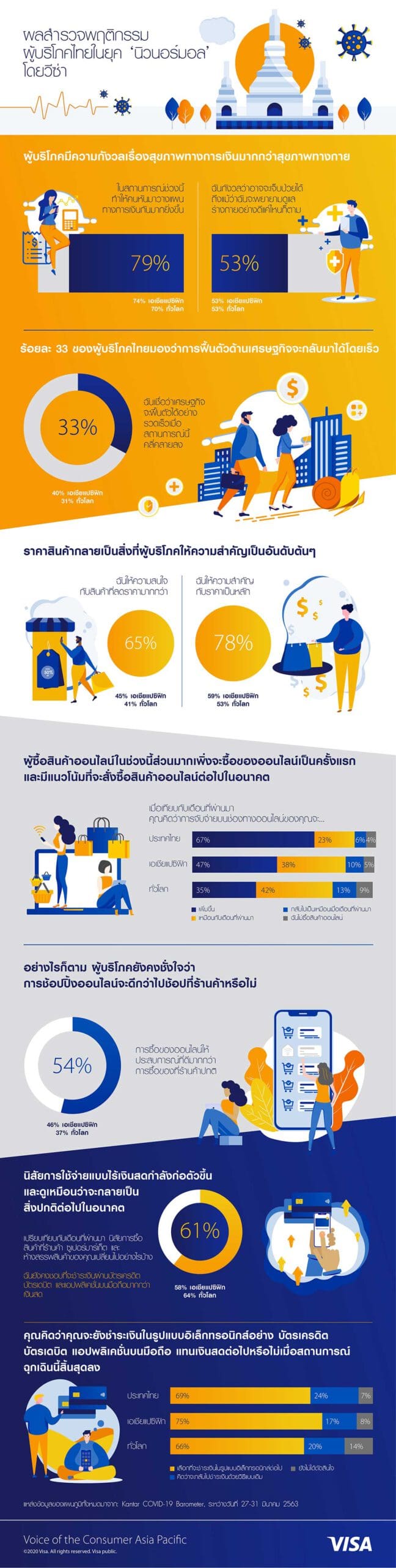 จากการสำรวจพบว่า 3 ใน 5 ของคนไทย (61 เปอร์เซ็นต์) กำลังพัฒนานิสัยในการใช้จ่ายแบบไร้เงินสด โดยเลือกที่จะใช้จ่ายด้วยบัตรชำระเงินหรือผ่านแอปพลิเคชั่นบนสมาร์ทโฟนมากกว่าการใช้เงินสด นอกจากนี้ เกือบ 7 ใน 10 ของคนไทย (69 เปอร์เซ็นต์) กล่าวว่า พวกเขามีแนวโน้มที่จะผูกติดกับการใช้จ่ายผ่านช่องทางดิจิทัลแทนการกลับไปใช้เงินสดแบบเดิมหลังสถานการณ์ปัจจุบันสิ้นสุดลง