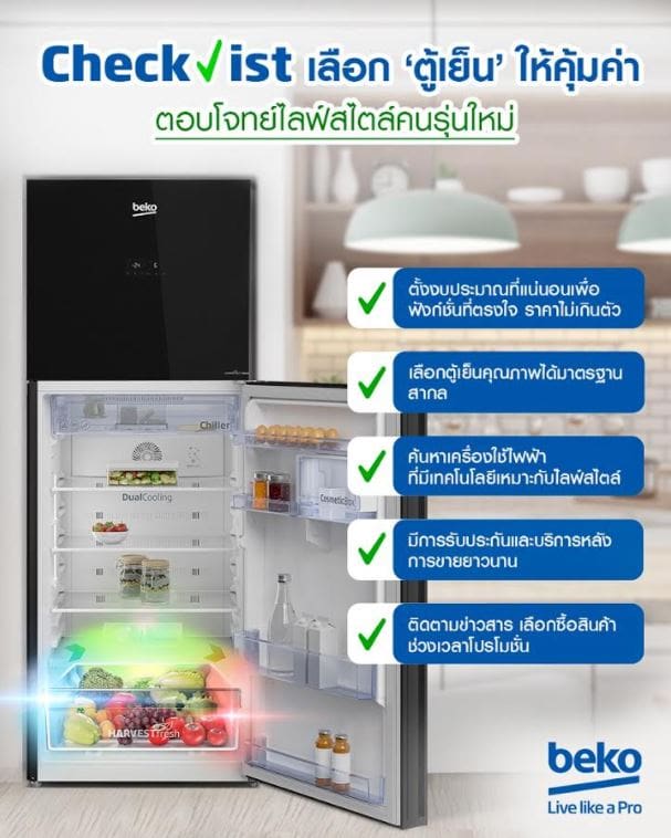- เลือกฟังก์ชั่นของตู้เย็นที่เหมาะกับไลฟ์สไตล์: หลังจากดูตู้เย็นที่ราคาพอดีเหมาะกับงบในกระเป๋าของเราแล้ว สิ่งสำคัญอีกข้อหนึ่งที่เราควรพิจารณาคือ ฟังก์ชั่นของตู้เย็นที่เหมาะกับการใช้งานและไลฟ์สไตล์ของเรา ถึงแม้ในปัจจุบันฟังก์ชั่นของตู้เย็นจะมีมากมายหลายแบบ ล้วนแล้วแต่มีความทันสมัย น่าซื้อ แต่เทคโนโลยีที่ทันสมัยก็อาจไม่มีความจำเป็น หากเทคโนโลยีนั้นไม่ได้ตรงกับการใช้งานของเรา ดังนั้นนอกจากจะซื้อตู้เย็นที่ราคาสบายกระเป๋าแล้ว ก็ควรมองหาตู้เย็นที่มีฟังก์ชั่นตรงใจ ตรงกับไลฟ์สไตล์ เพื่อให้เราใช้ประโยชน์ได้อย่างคุ้มค่า และที่สำคัญนอกจากฟังก์ชั่นพื้นฐานของตู้เย็นแล้วเราสามารถเลือกซื้อตู้เย็นที่มีเทคโนโลยีเสริมที่ช่วยดูแลเราในวิถีชีวิตยุค New Normal อย่างตู้เย็นของ Beko ที่มีเทคโนโลยี HarvestFresh ช่วยคงคุณค่าวิตามิน A และ C ในผักผลไม้ได้ยาวนานกว่าตู้เย็นทั่วไปด้วยพลังแสง 3 สี ที่จำลองจากกระบวนการสังเคราะห์แสงอาทิตย์ และเทคโนโลยี EverFresh+ ในช่องแช่ผักผลไม้ที่สามารถปรับระดับความชื้นตามประเภทของผักและผลไม้เพื่อรักษาความสดของผักผลไม้นานขึ้นถึง 3 เท่า