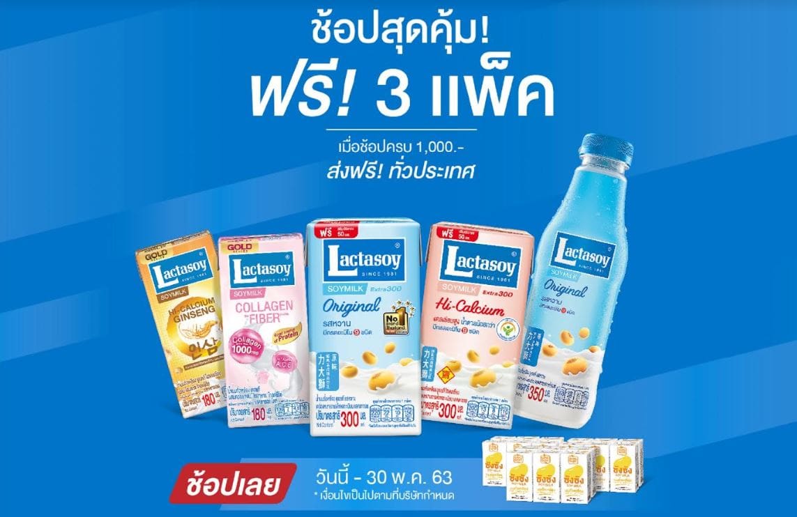 อย่างไรก็ดี แลคตาซอยได้จัดโปรโมชั่นส่งเสริมการขาย โดยผู้ที่สั่งซื้อแลคตาซอยผ่านช่องทางออนไลน์ “ช้อปสุดคุ้ม ส่งฟรี! ทั่วประเทศ” เมื่อซื้อสินค้ายกลัง ทุกขนาด ทุกรสชาติใน lactasoy Official Shop และมียอดสั่งซื้อสินค้าครบ 1,000 บาท จะได้รับนมถั่วเหลืองคั้นสด “ซังซัง” ขนาด 300 มิลลิลิตร จำนวน 3 แพ็ค โดยสามารถสั่งซื้อได้ที่ www.lactasoy.com/shop ตั้งแต่วันนี้ถึง 30 พ.ค. 63