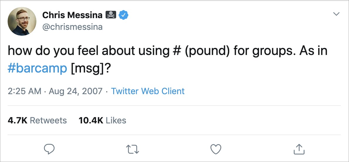 เมื่อ 12 ปีที่แล้วในวันนี้ (23 สิงหาคม 2550) แฮชแท็กแรกของโลกเกิดขึ้นบนทวิตเตอร์โดย คริส เมสซินา ผู้ซึ่งทวีตข้อความแนะนำให้ใช้สัญลักษณ์ # เพื่อช่วยจำแนกบทสนทนาบนทวิตเตอร์ แล้วเรื่องราวต่อจากนั้นก็กลายเป็นประวัติศาสตร์ และทวิตเตอร์ก็กลายเป็นแพลตฟอร์มสำคัญที่รวบรวมแหล่งข่าวและความคิดเห็นของผู้คนทั่วโลก