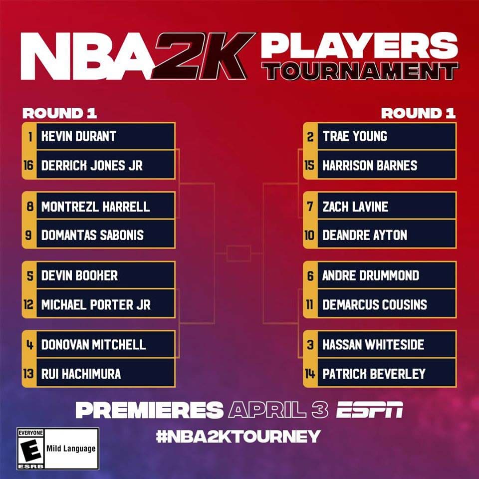 2K, NBA และ NBPA ประกาศการแข่งขัน “NBA 2K Players Tournament” โดย 16 ซุปตาร์ NBA จะร่วมประลองลีลายัดห่วงในศึกเกม NBA 2K20 ซึ่งจะเริ่มในวันที่ 3 เมษายน 2563 ทางช่อง ESPN และ ESPN2 ประเดิมคู่แรกระหว่าง Kevin Durant จาก Brooklyn Nets และ Trae Young จาก Atlanta Hawks จะลงแข่งในรอบแพ้คัดออก ผู้เล่นจะใช้ Xbox one เพื่อแข่งขันในทัวร์นาเมนท์นี้เท่านั้น ผู้ชนะการแข่งขันจะได้ครองตำแหน่ง NBA 2K20 Champion และรับเงินรางวัลมูลค่า100,000 เหรียญสหรัฐ จากทาง 2K, the NBA และ the NBPA เพื่อบริจาคช่วยเหลือสถานการณ์ไวรัสโคโรนา