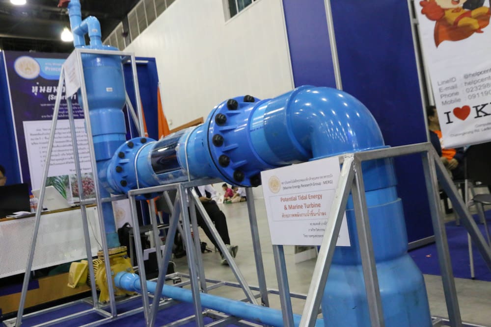 ที่เห็นอยู่ไม่ใช่ท่อพีวีซีที่ไหน แต่เป็นนวัตกรรมกังหันไฟฟ้าพลังงานน้ำขึ้น – น้ำลง ส่งตรงมาไกลจาก สจล. วิทยาเขตชุมพร ที่นำเอาข้อได้เปรียบเรื่องภูมิประเทศมาพัฒนาเป็นนวัตกรรมด้านสิ่งแวดล้อม และพลังงาน โดยอาศัยแรงกลศาสตร์จากปรากฏการณ์น้ำขึ้น – น้ำลง มาพัฒนาเป็นกังหันกำเนิดไฟฟ้าขึ้น ซึ่งตอบโจทย์เรื่องพื้นที่ติดริมทะเล และในพื้นที่ห่างไกล ที่อาจเกิดปัญหาไฟฟ้าเข้าไม่ถึง หรือไฟฟ้าดับบ่อยครั้ง นอกจากนี้ นวัตกรรมดังกล่าวยังได้รับการพัฒนาขึ้น เพื่อเป็นองค์ความรู้ Know How ในการผลิตกังหันกำเนิดไฟฟ้าจากพลังงานน้ำ ในสถานการณ์ และพื้นที่ที่แตกต่างกันอีกด้วย