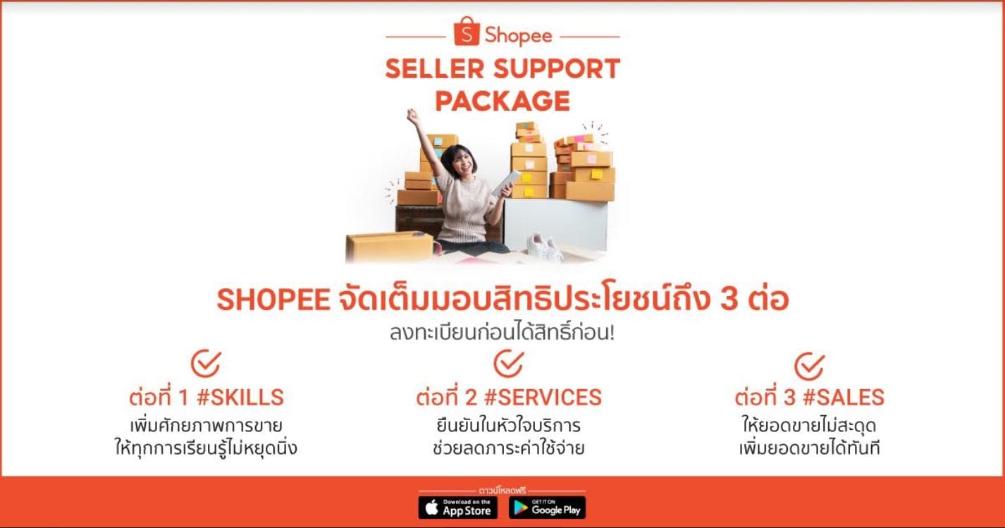 ดูรายละเอียดเพิ่มเติมและสามารถลงทะเบียนเข้าร่วมโครงการ Shopee Seller Support Package ได้ที่ www.shopee-seller-support.comดาวน์โหลดแอปพลิเคชันช้อปปี้ได้ฟรีที่ App Store หรือ Google Play.